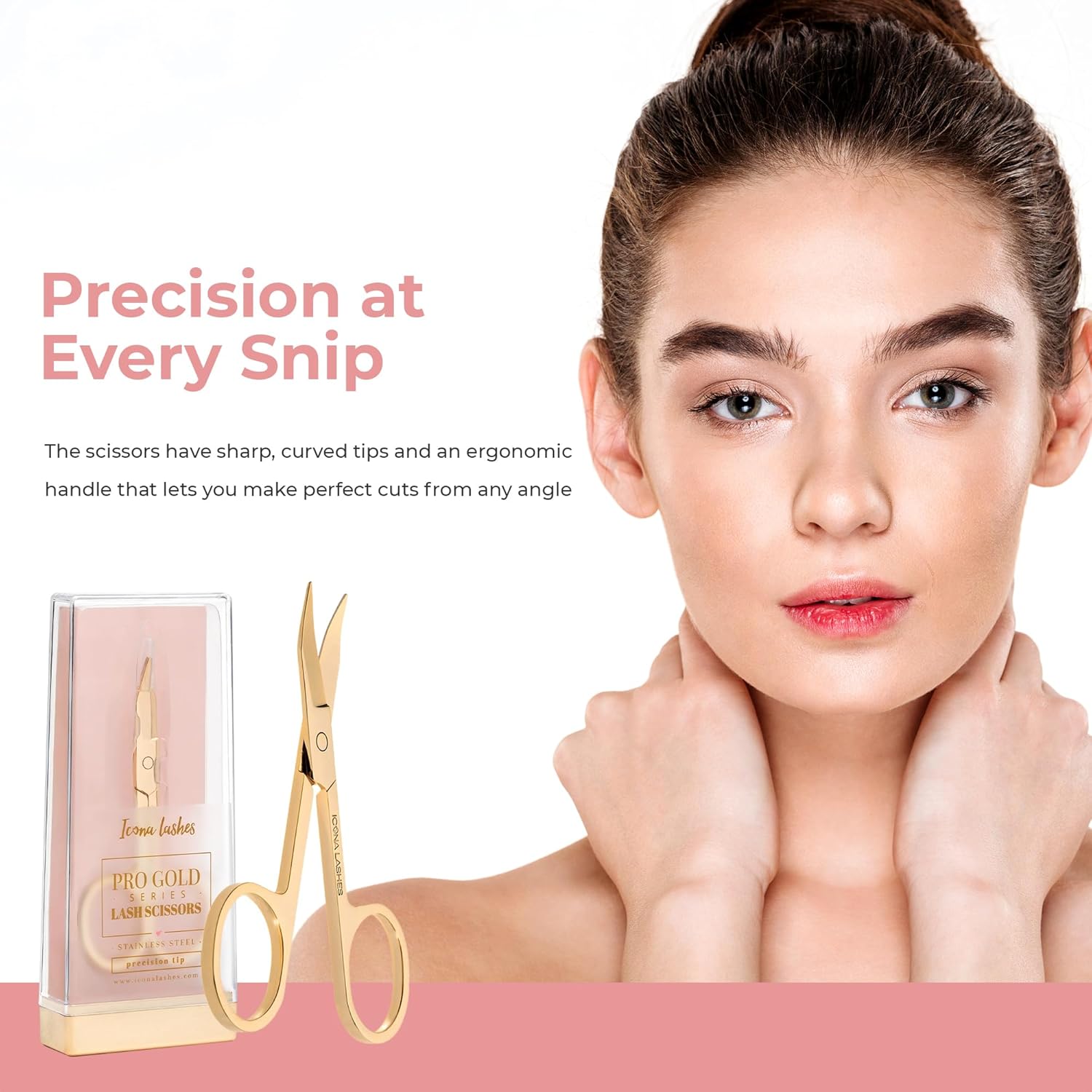 Eyelash Scissors - 24K Gold-Plated Stainless Steel Lash Scissors for Cutting False Lashes - Curved Scissors with Precision Tips for Trimming Cuticle, Eyebrow, Beard, Facial & Nose Hair