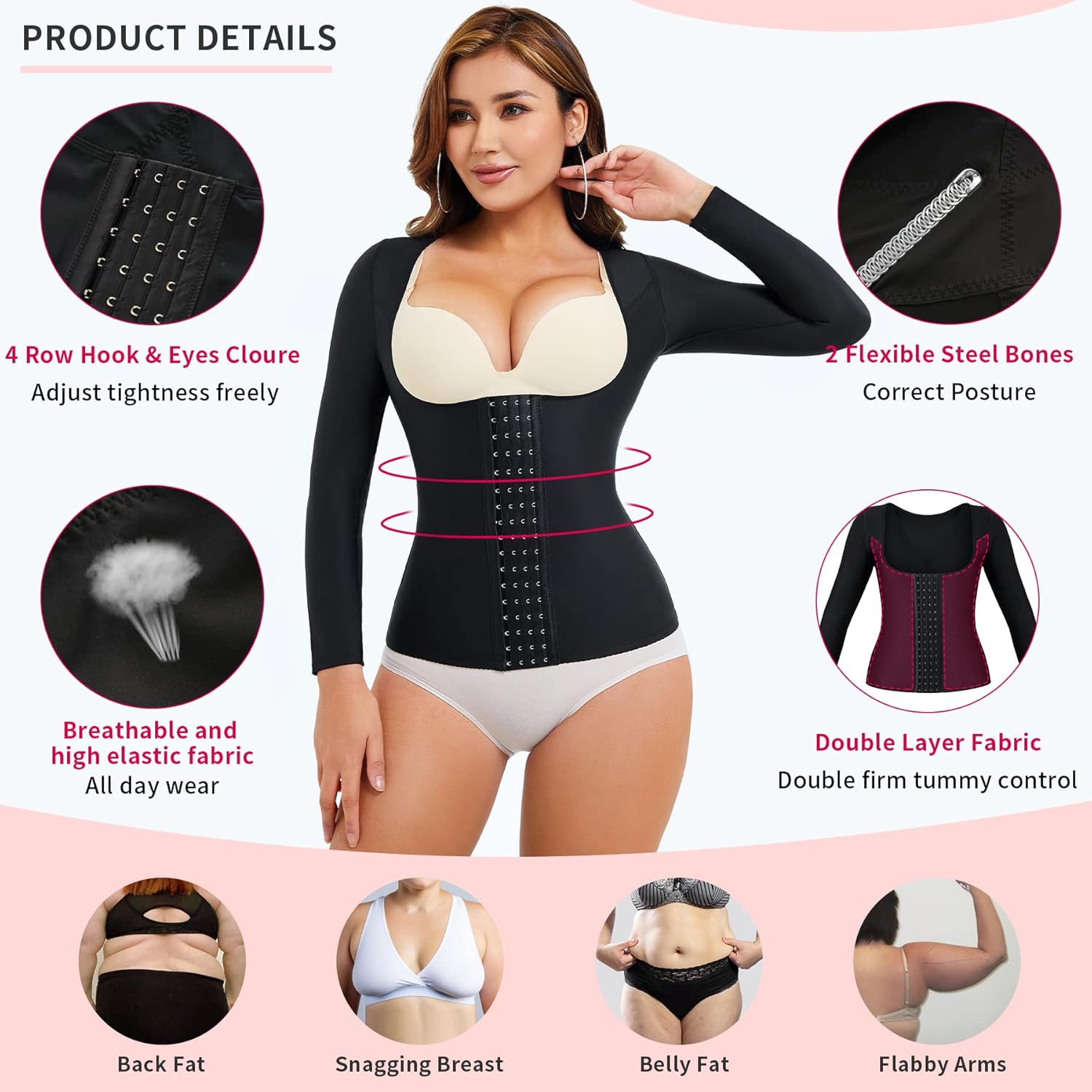 - UPPER ARM SHAPER COMPRESSION : Our waist training corset design with high stretchable long sleeve, best for arm liposuction recovery to tighten loose skin, smooths and tights bumps and bulges, reduce arm and back flab, hide your back rolls, give your a slimmer figure. If you no need too tight,we suggest you to have the bigger size.