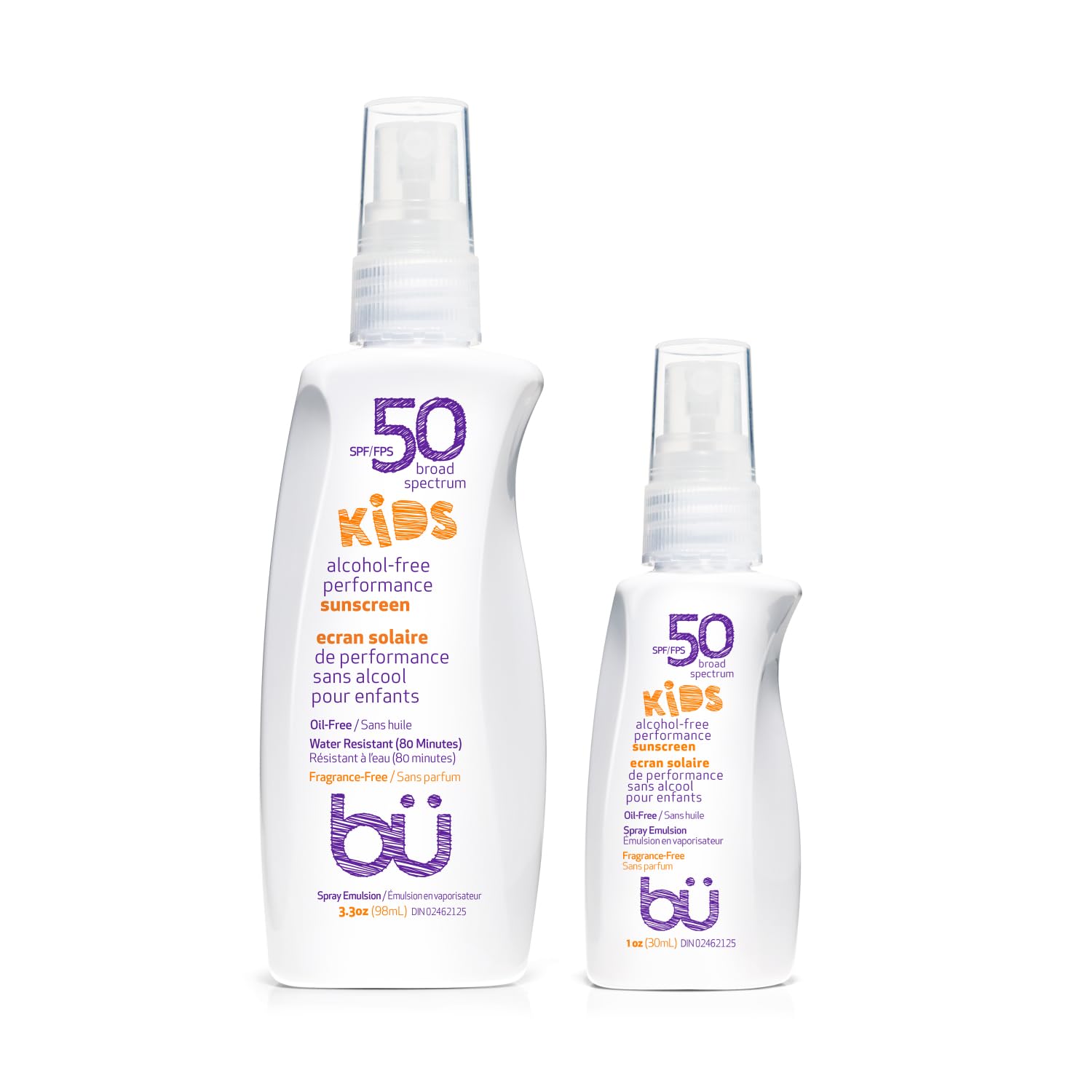 BU SPF 50 Fragrance Free Kids Sunscreen Spray for Face and Body, TSA Travel Size Sunscreen, Clear Non Aeorsol Spray, Non Greasy, Water Resistant and Oil Free, 3.3 oz and 1 oz (2-Piece Bundle)