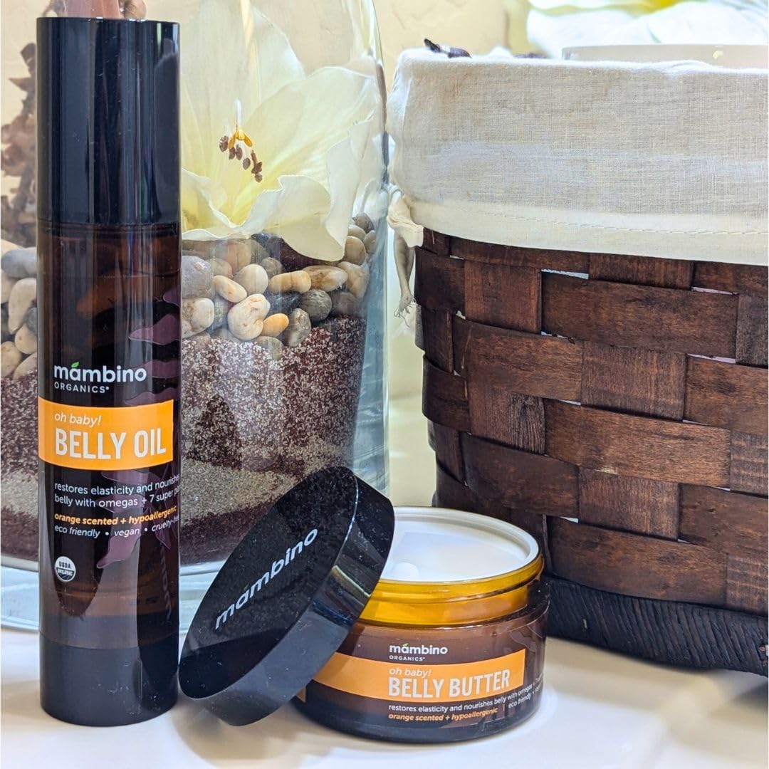 - MAMBINO ORGANICS BELLY BUTTER IN OIL FORM: This organic belly oil for stretch marks is a special blend of nature's most nourishing and healing botanicals; softens the appearance of old scars and limits the development new strech marks; Restores elasticity and hydration, while soothing dry, itchy skin.