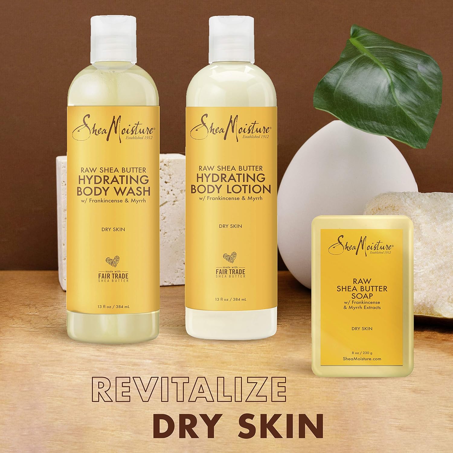 - SheaMoisture's Raw Shea Butter Bath and Body Kit contains our 13 oz Body Wash, 13 oz Lotion, and 8 oz Bar Soap in the Raw Shea Butter Collection