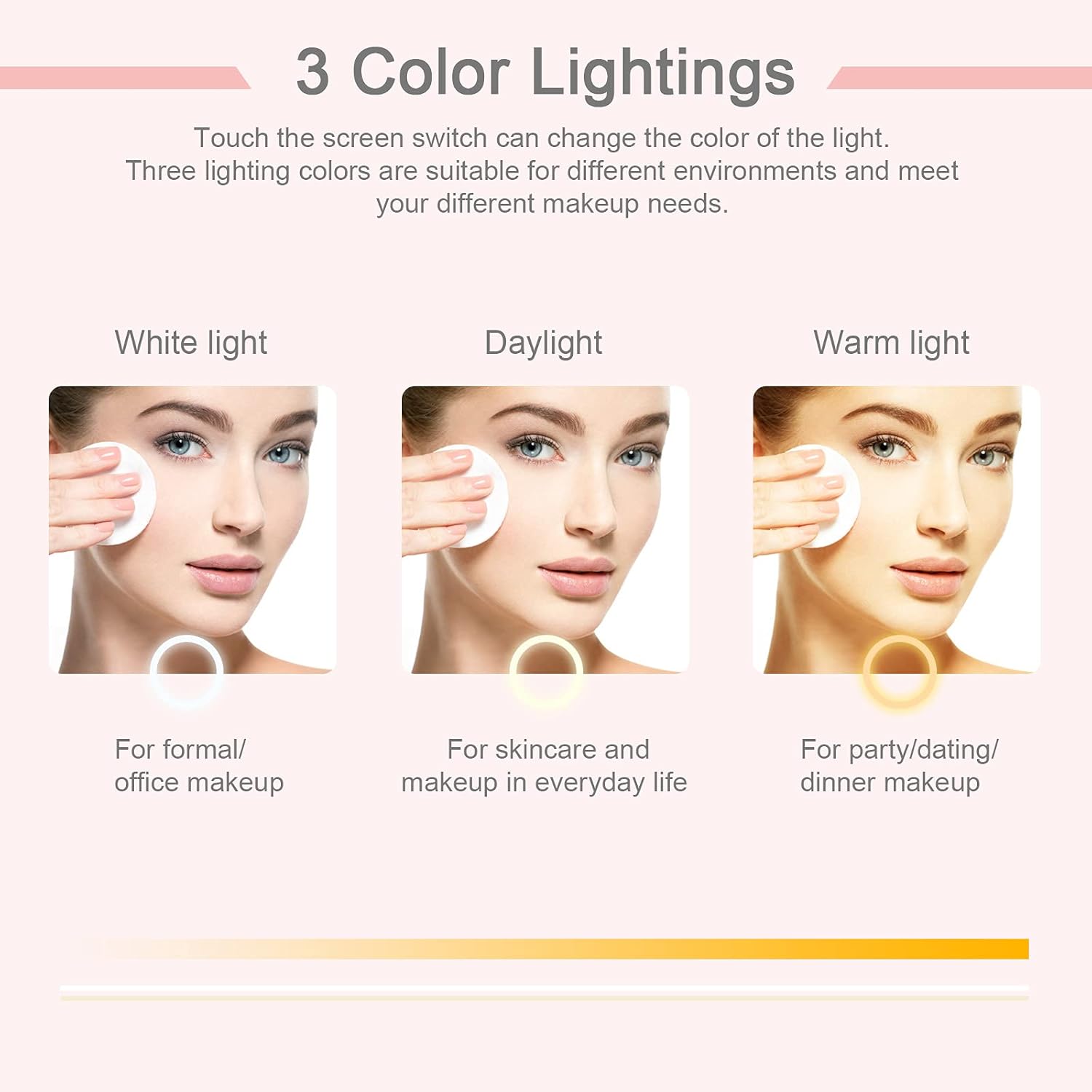 - 【 Powerful Light Brightness 】- This lighted makeup mirror surrounded by 72Pcs bright LED lights that can give you great assistance for making up and make you have perfect viewing while applying make up in dark or poorly lit areas. You can choose different light colors, white light, warm light and natural light according to your needs.