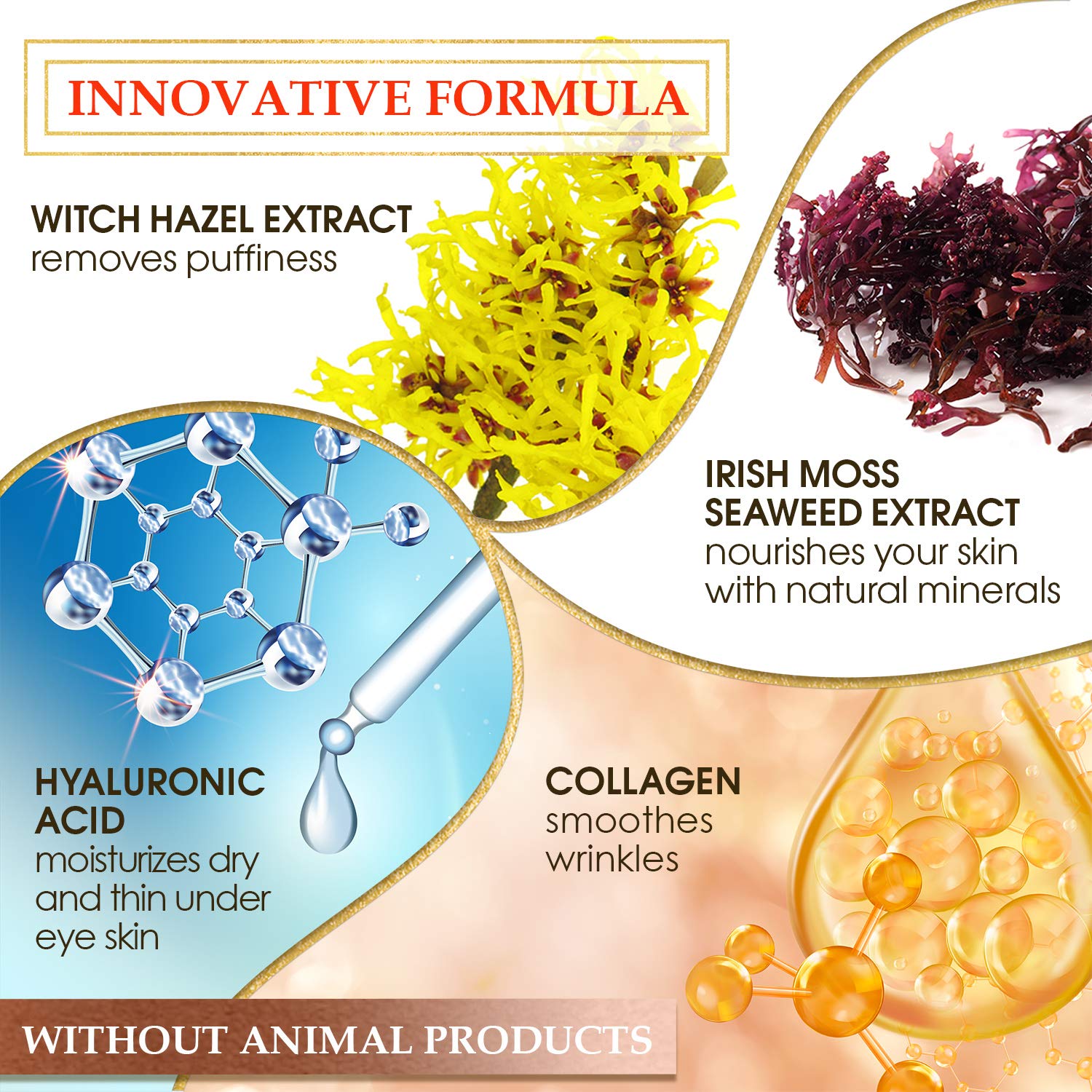 - ULTRA EFFECTIVE - Infused with goodness of witch hazel, Irish moss seaweed, collagen from hydrolyzed wheat protein & hyaluronic acid, the EYE GEL PADS effectively help repair damaged & tired skin