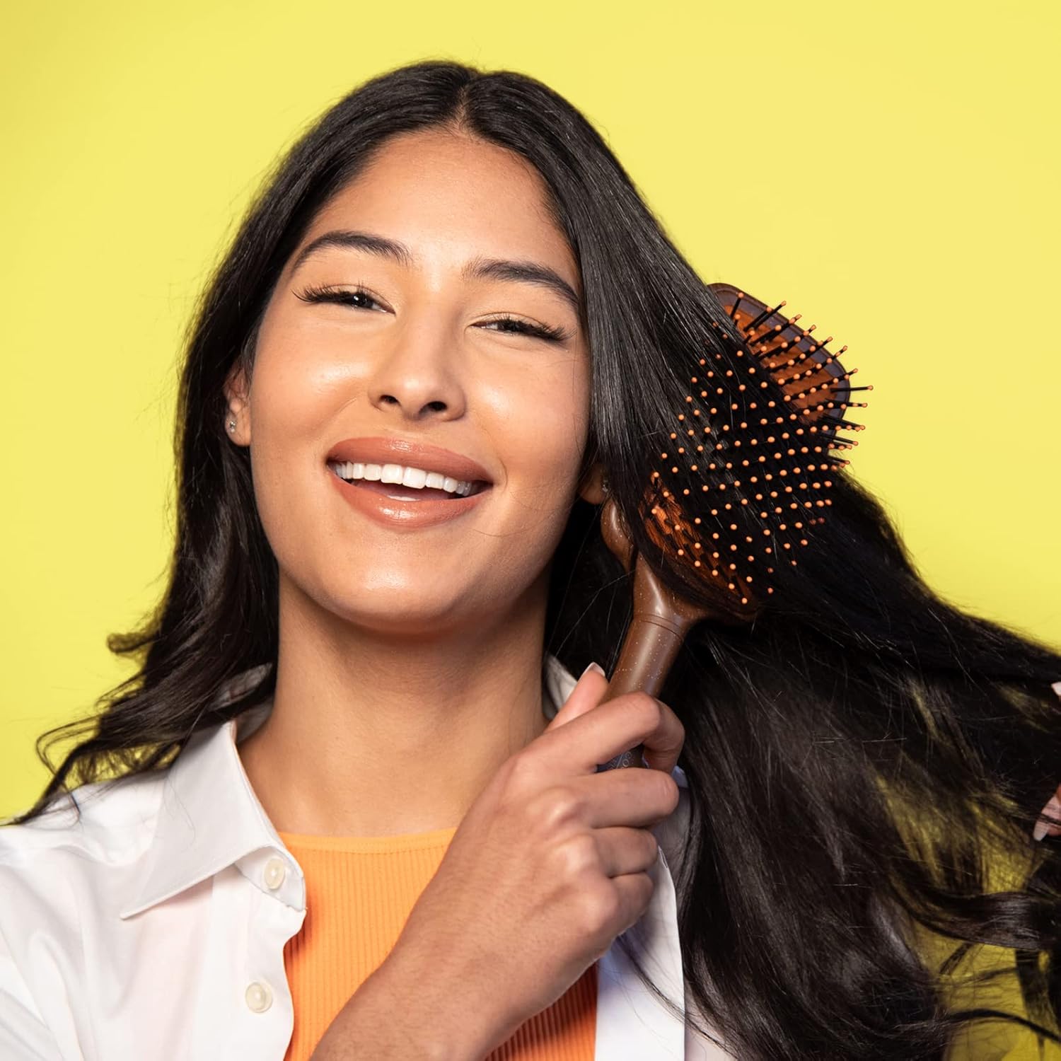 - Large cushioned paddle contours to the shape of your head for comfortable styling with professional results. Coconut oil helps smooth the hair cuticle, reduce frizz and breakage. Shiny looking hair with each stroke of the brush.