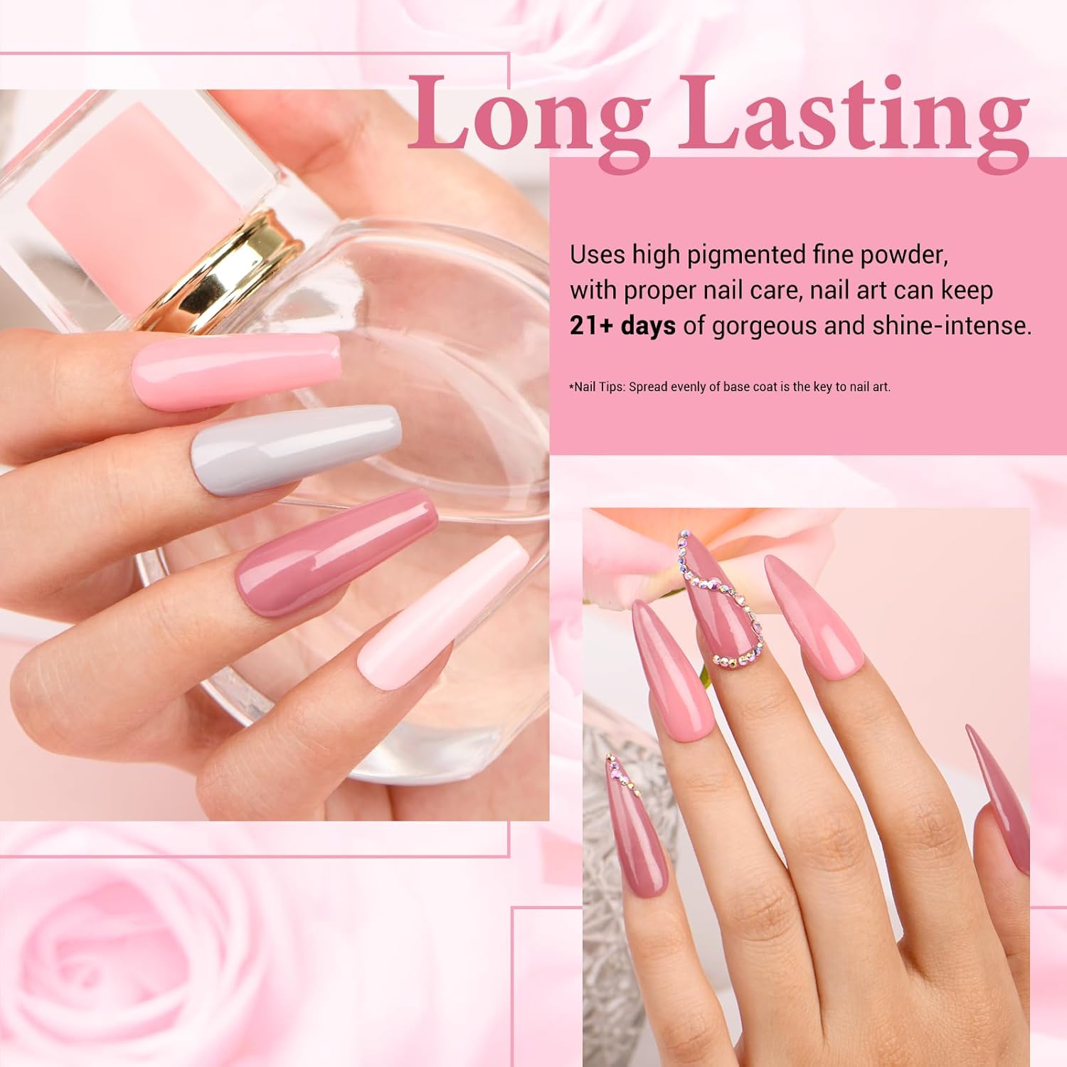 - ⏱【【Superior Quality & Long Lasting】 AZUREBEAUTY dip powder nail kit is long-lasting and anti-chipping, anti-peel off. The color is full and natural-looking, light, and has an impeccable shine finish. It can keep the nail art gorgeous and shiny for more than about 28 days with proper application. (REMINDER: The effection of dip powder may show differently in different people, 2~3 base coats while using will be the best.)