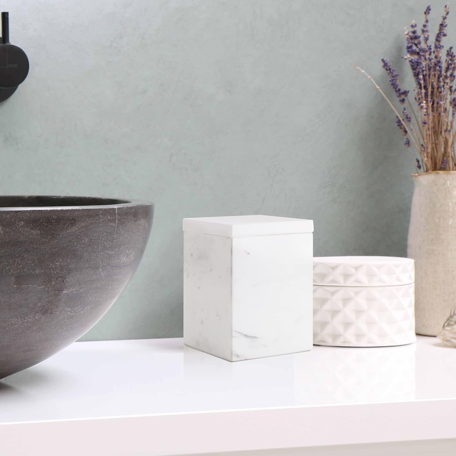 WORHE Marble Canister Natural Stone Qtip Holder with Lid Square Bathroom Vanity Organizer for Makeup Sponge Coffee Bean Dispenser Storage Jar Case for Home Decor White (DLW201)
