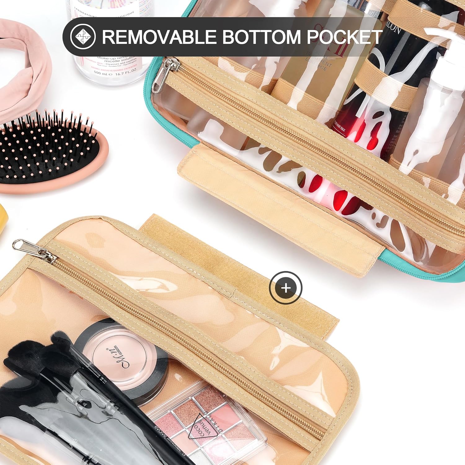 - CONSIDERABLE DESIGN - The elastic bands inside the two main compartments can keep the different height bottles fixed and upright. Your comb, toothbrush, razor, and leak-prone makeup can all go in there, even a hair dryer. 360° metal hook gives you a variety of hanging options.