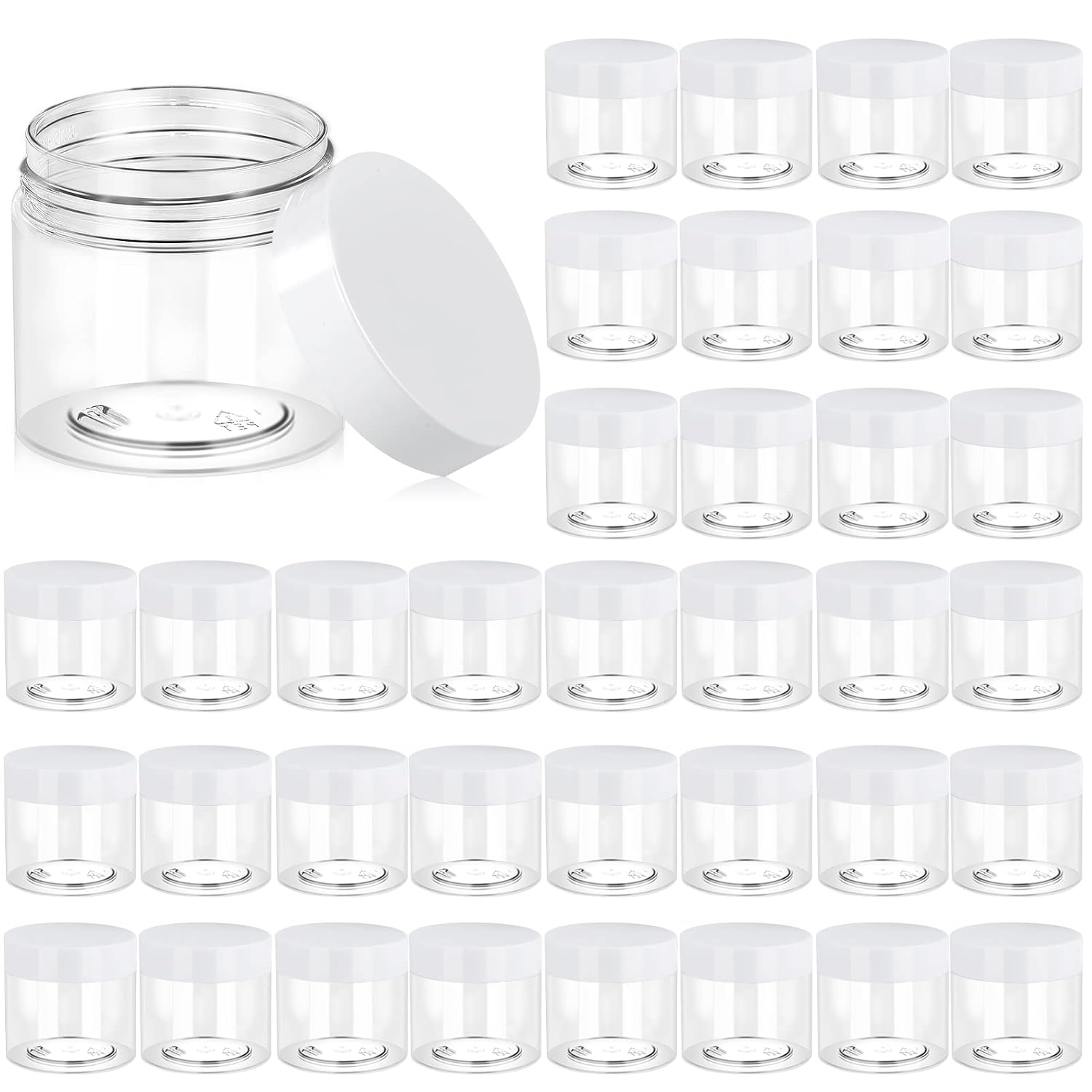 - ★【LEAK PROOF AND AIRTIGHT】: Each Jar comes with a screw-on lids with foam liners which creates an airtight seal when the lid is securely screwed onto the container. You do not need to worry about leakage, especially when you carry them in your bags. Plastic container jars with white lid and transparent clear bottom, lovely in appearance. See-through plastic jars display your contents.