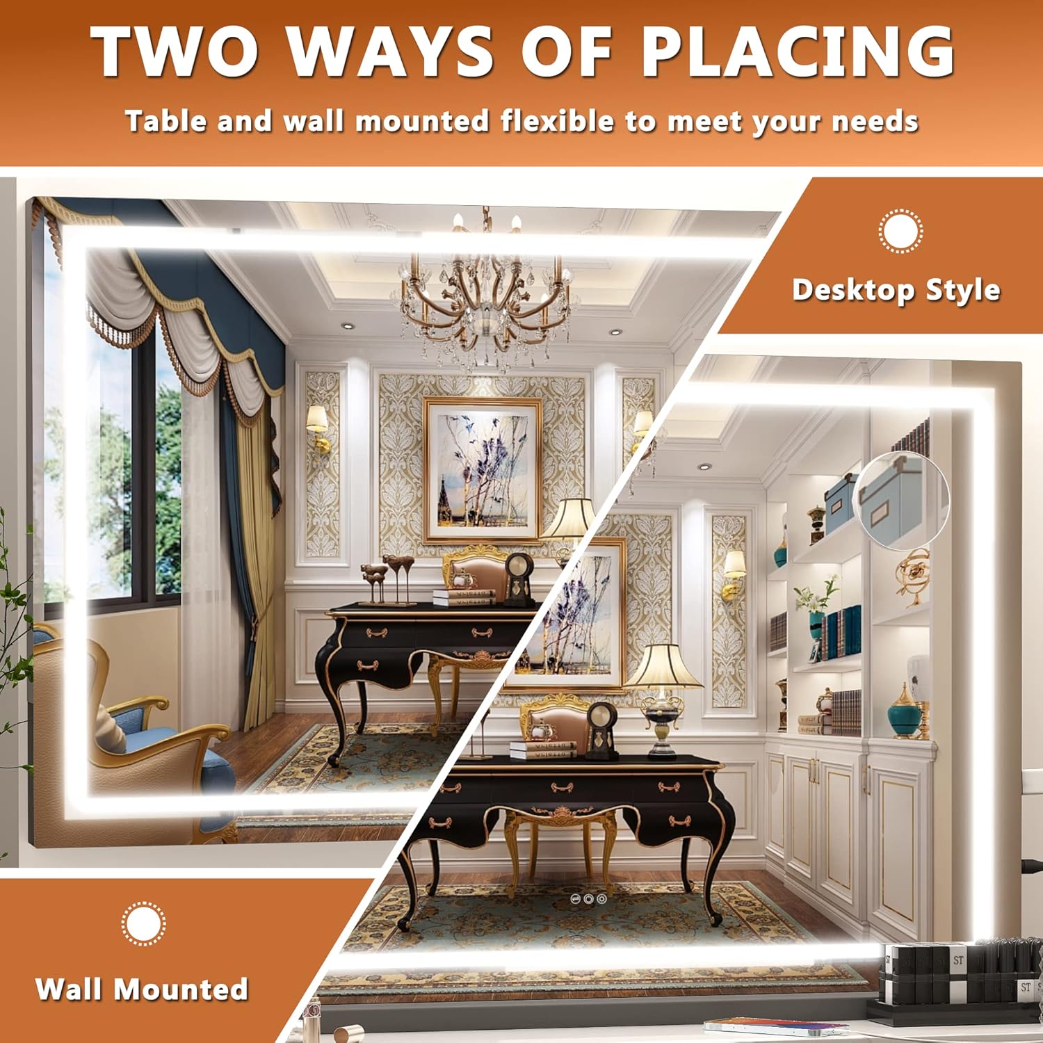 - đăDetachable Mirror Base & Hanging settingăWall mounted or Table Top design meet your different needs.This large makeup mirror designed with detachable base and two back hole for nail. 1.Removing mirror base with a screwdriver. 2.Knocking two nails on the wall. 3.Hanging mirror on the wall.