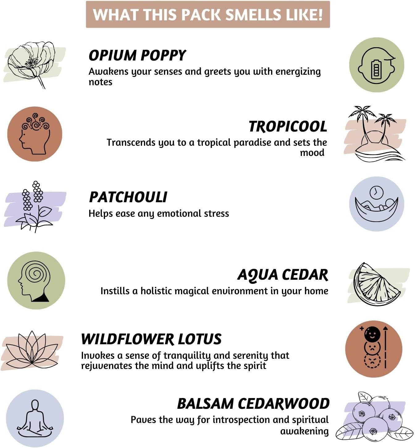 - [Fragrance Note] - These inscents feature a beautiful blend of woody and musky fragrances like opium poppy, tropicool, patchouli, aqua cedar, wildflower lotus, and balsam cedarwood. The calming effect of cone incense can promote emotional balance, uplift your mood, and nourish your spirit.