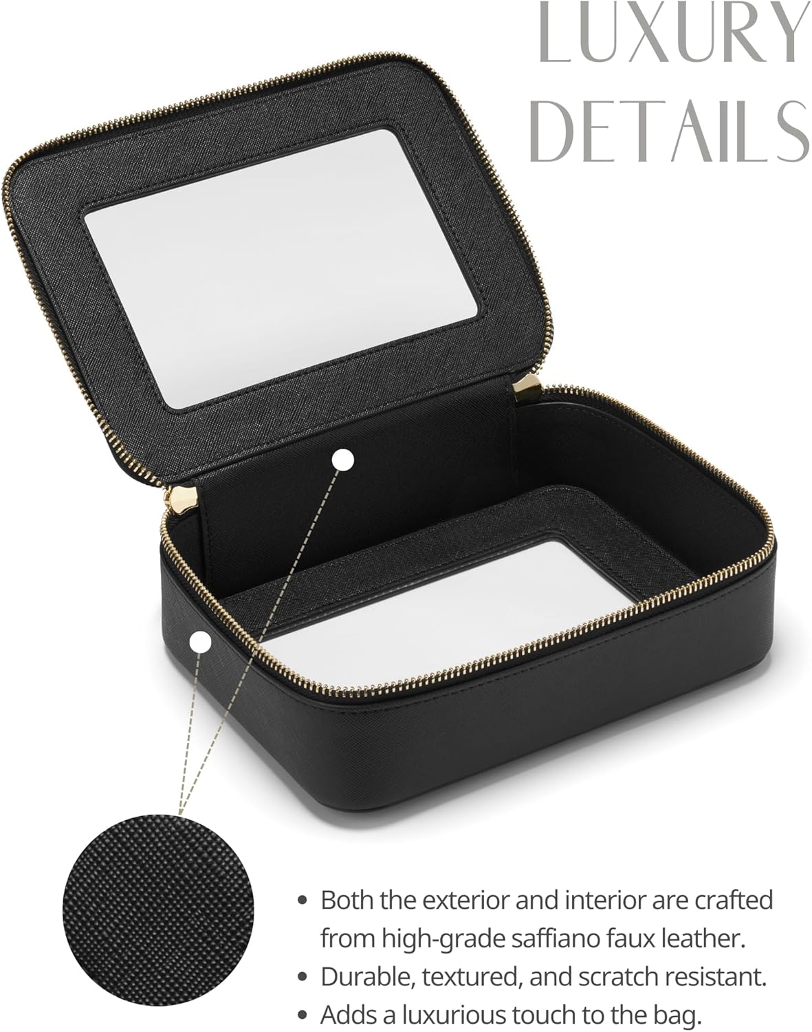 - [Compact and Portable] – The black travel make up bag measures 8.3'' x 6.1'' x 2.4'' (21cm x 15.5cm x 6cm), designed to offer a compact and travel-friendly solution for organizing your makeup and toiletry essentials. It can be easily fit into a variety of bags, whether you prefer to carry it in a handbag, tote, or travel luggage.