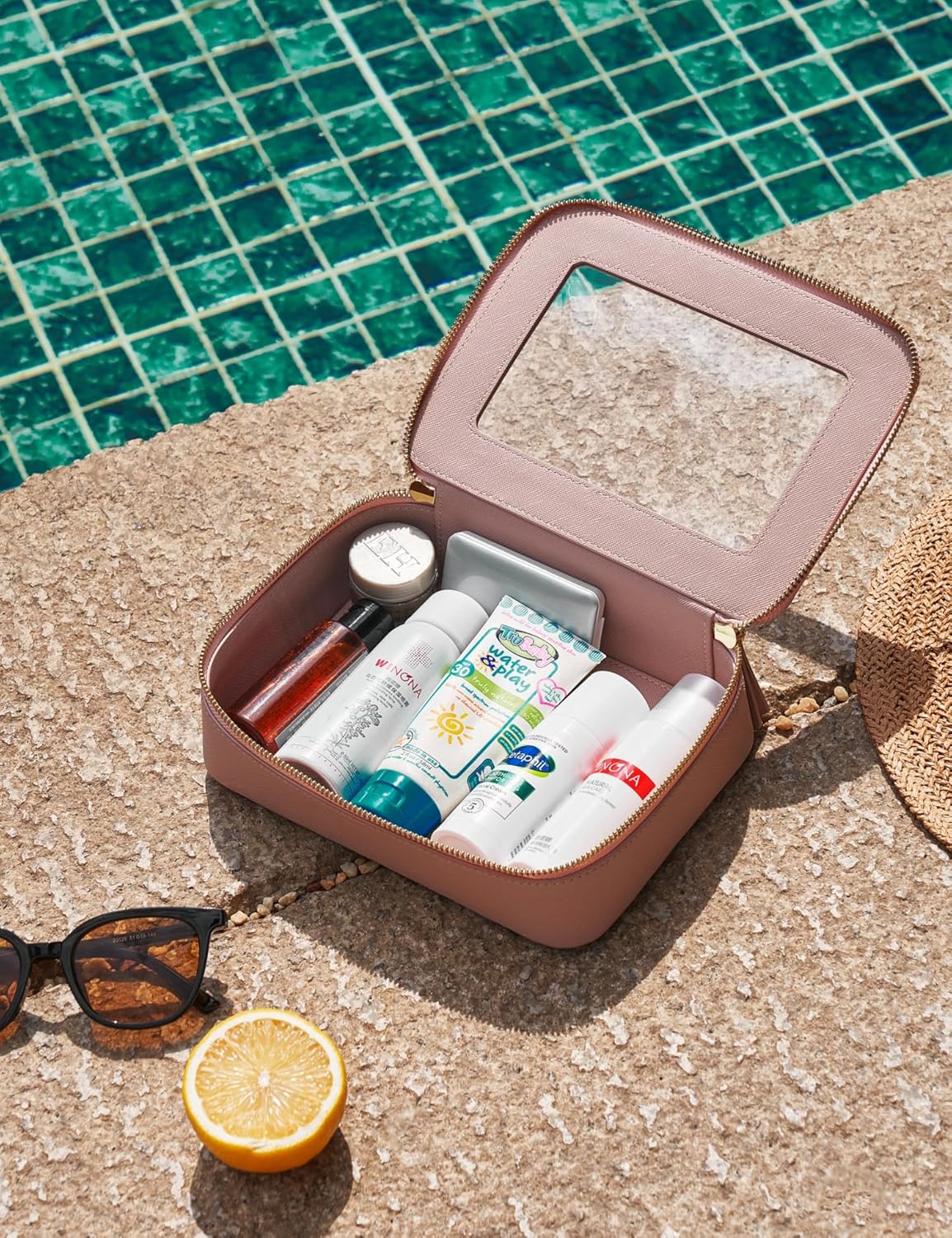 - [Premium Material and Durability] – The clear cosmetic case, both the exterior and interior, is crafted from high-grade saffiano faux leather, which is highly scratch resistant, durable and exceptionally easy to keep clean. It features a smooth zipper for secure closure, and elegant light gold metal hardware accents, adding a luxurious and sophisticated touch to the bag's overall design.