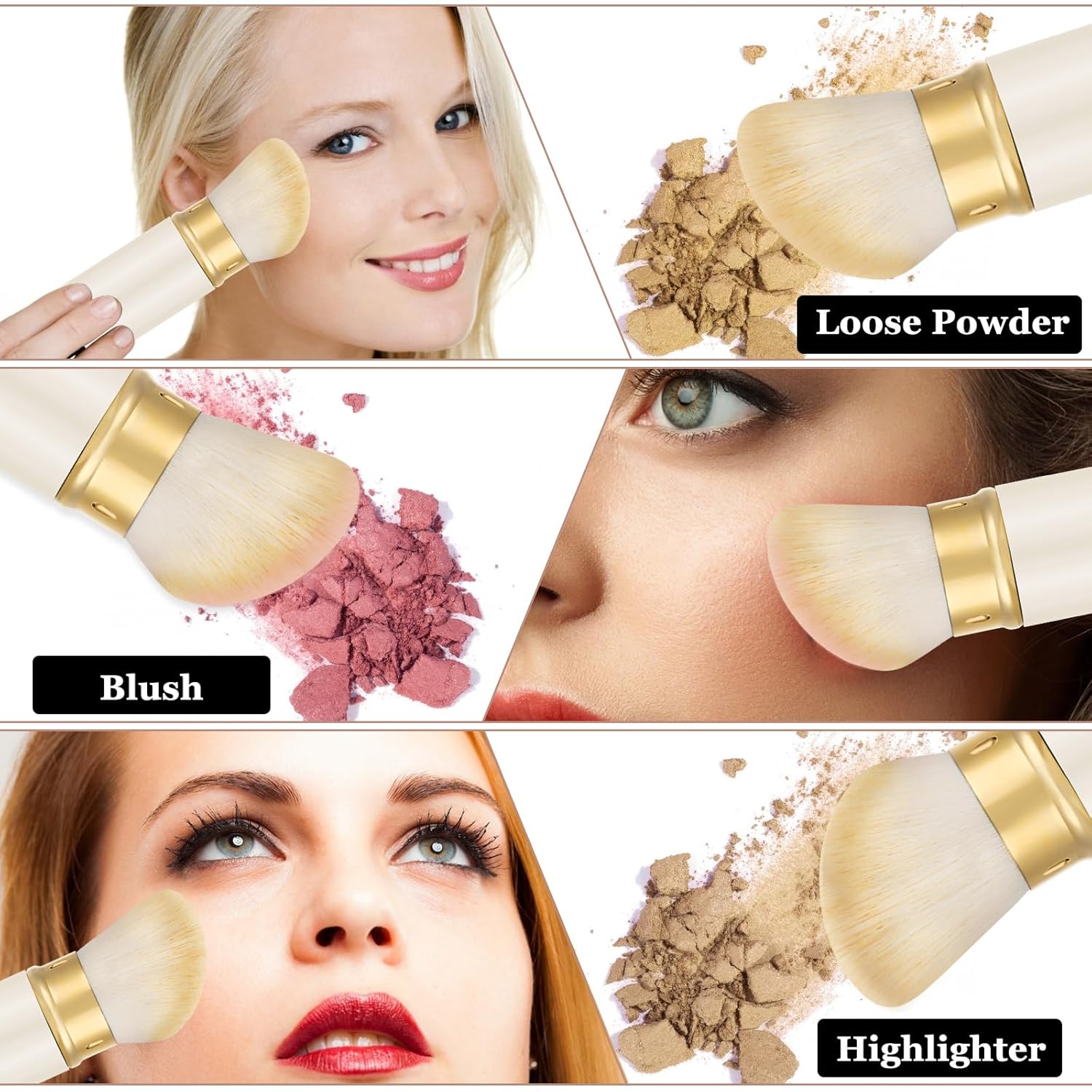 - ăSoft and Silky Brush Hairă The angled kabuki foundation brush made with high quality synthetic fibers, super soft, perfect for blending Liquid foundation , sunscreen, blush, cream, self tanner, buffing, stippling, concealer, bronzer, loose powder cosmetics or nail dust. allows you to tap on products for flawless, air-touched, full-coverage finish, don't absorb foundation into the brush itself.