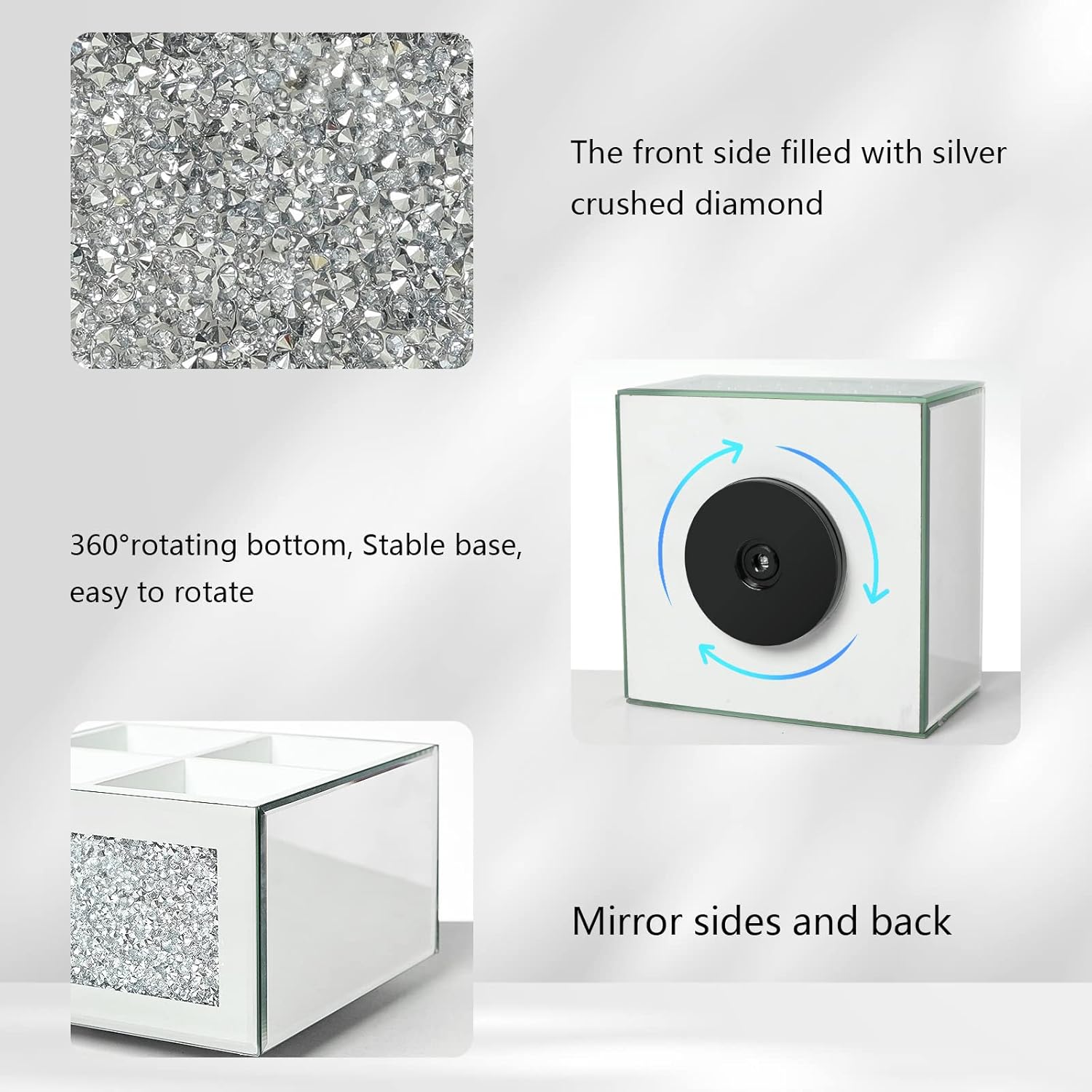 - Material: each side of the mirrored rotating makeup brush holder edged with glass mirror, and the front side filled with crushed diamond, the inside compartment is made of wooden, will be an eye-catching bling vanity decor.