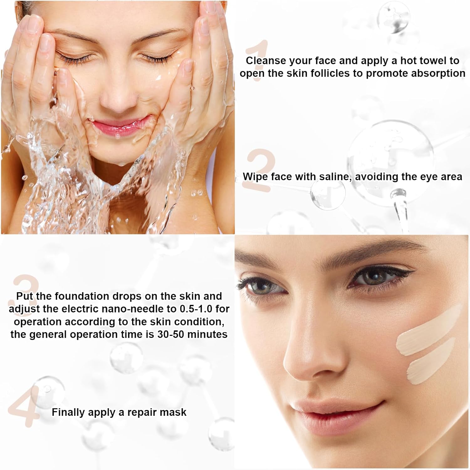 - How to use :1, clean facial skin to keep dry 2, with a towel hot compress 5-10 minutes to open the hair follicles to promote absorption 3, with saline wipe face 4、Drop the foundation on the face and use the microneedle to operate"