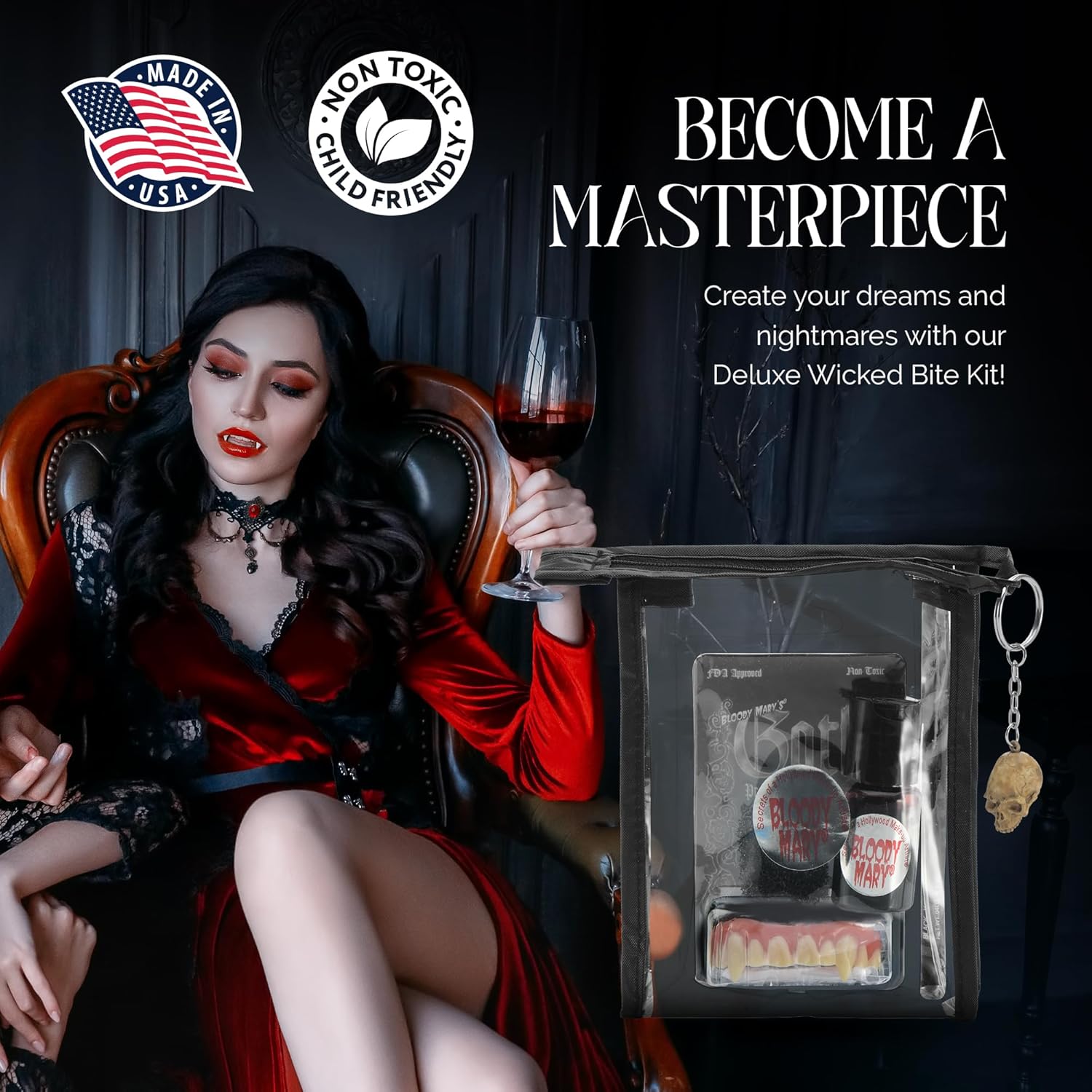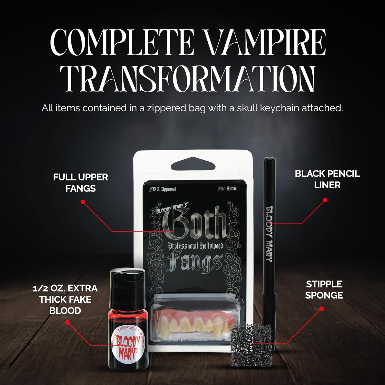- MAKEUP TO DIE FOR - Become a fascinating and frightening Vampire victim with Bloody Mary's Makeup Sets! Each kit includes 1/2 oz. extra thick blood, black pencil liner, full upper fangs, stipple sponge, detailed instructions and a zippered bag.
