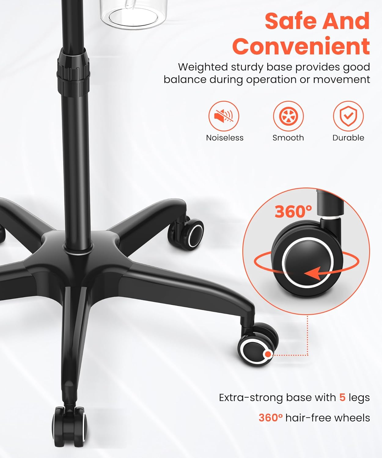 - Stability & Practicality: This facial steamer features a 4-leg wheel stand base for easy movement and stability during use. Ideal for salons, spas, or home, it delivers professional-quality treatments, ensuring a radiant and rejuvenated complexion every time
