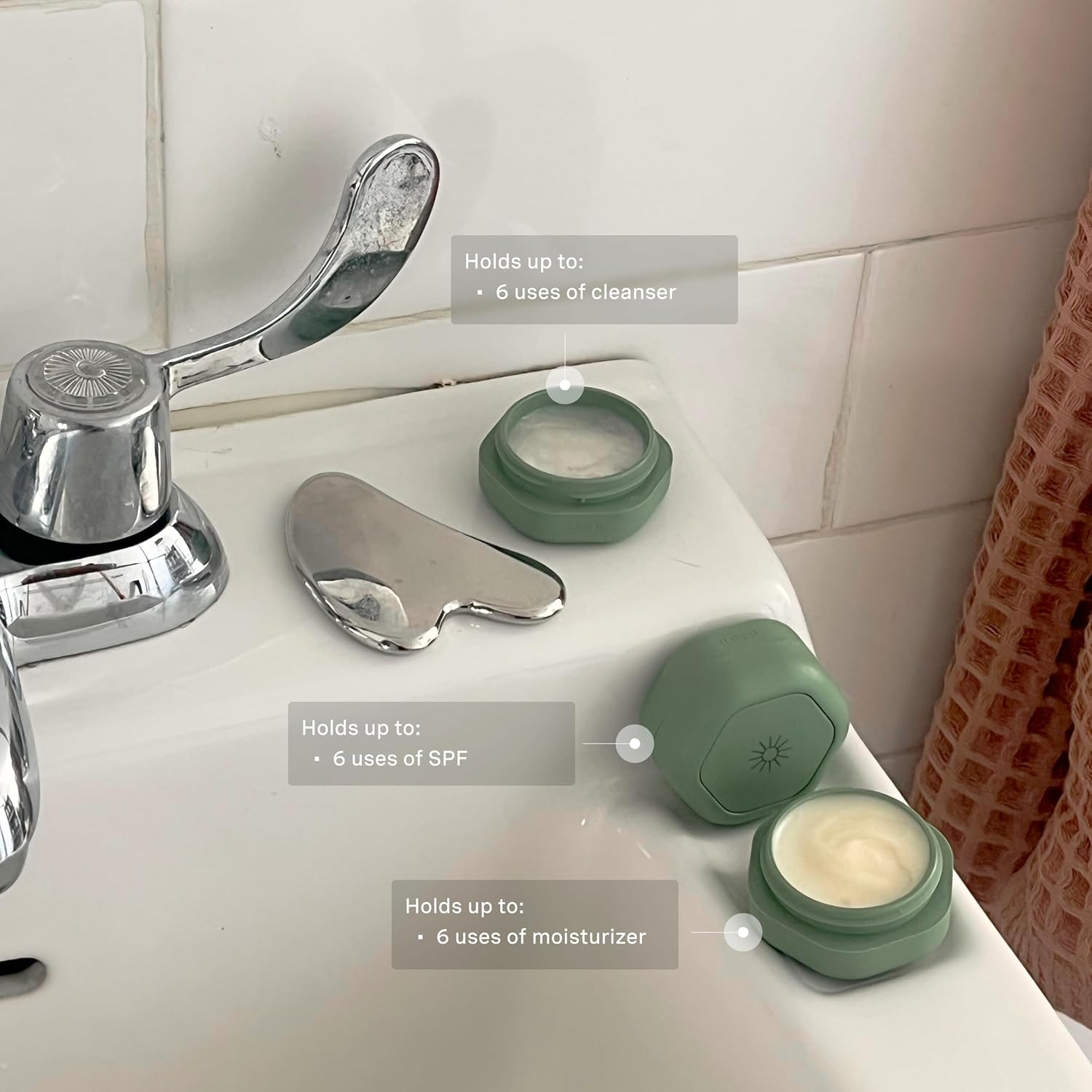 Cadence Travel Containers Basic Skincare Set - Magnetic Containers with Lids,Carry On Travel Essentials For Women/Men - 3 Small Capsules (0.56oz) - Cleanser, Moisturizer & Sun-Icon Labels - Eucalyptus