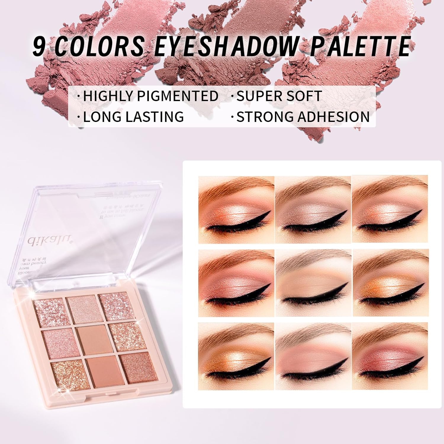 - [Makeup Set] The ideal starter makeup kit includes 9 colors eyeshadow palette, dual-ended counter and highlighter stick, full coverage liquid foundation, dual-ended eyebrow pencil, eyeliner, waterproof mascara, lip gloss, 5 PCs makeup brushes set, makeup sponge. All women’s makeup essentials are included.