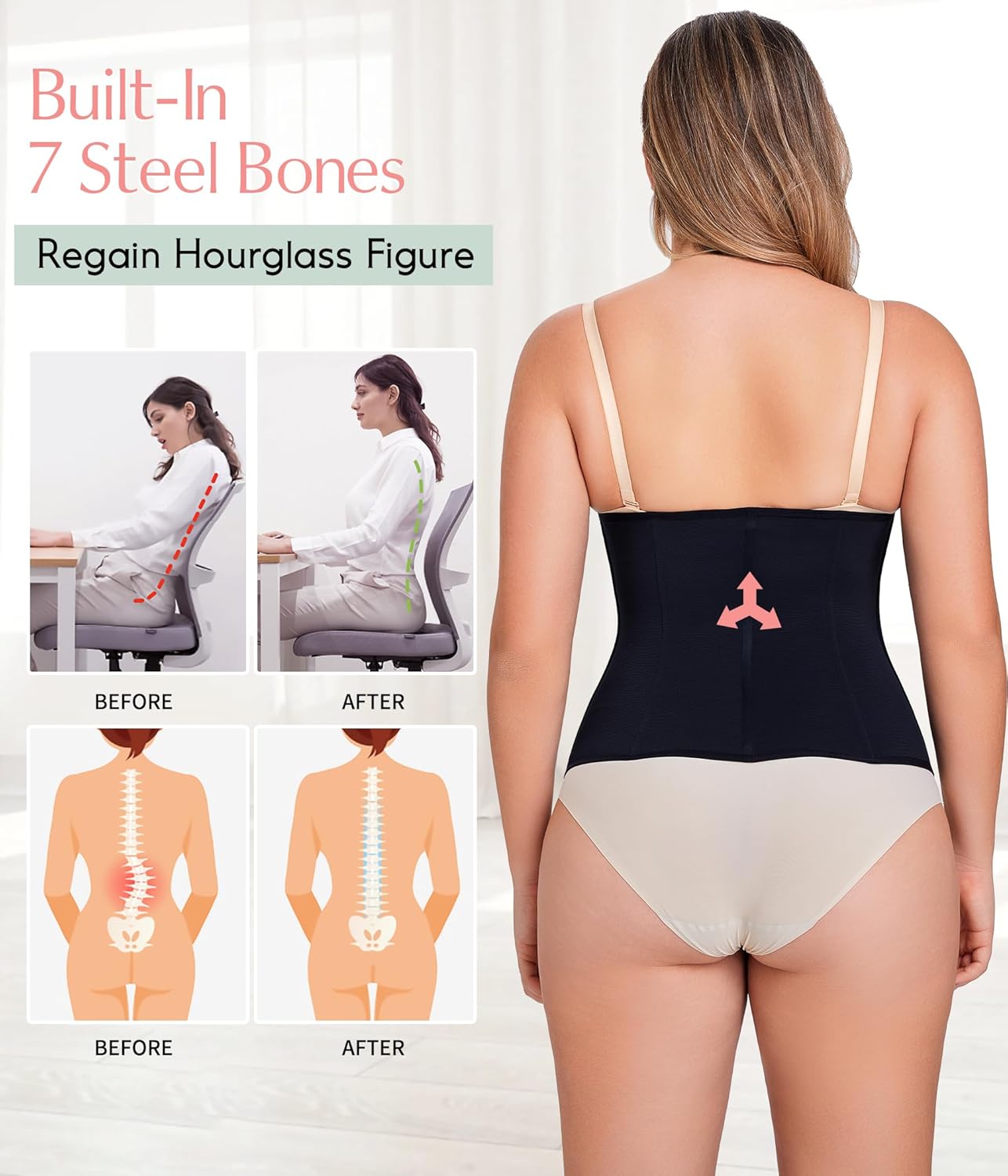 • STRONG SUPPORT LOW BACK SHAPEWEAR: The shapewear for women tummy control equips with 7 spiral steel bones fitted to curve naturally, encouraging an upright posture all time without rolling up and down, no matter you're doing housework, working, or exercising. Back fat shapewear provides all-around support and pressure to the waist area, control the flabby back, evenly distribute pressure along the back to relief back pain and improve hunchback, so as to achieve a more elegant appearance.
