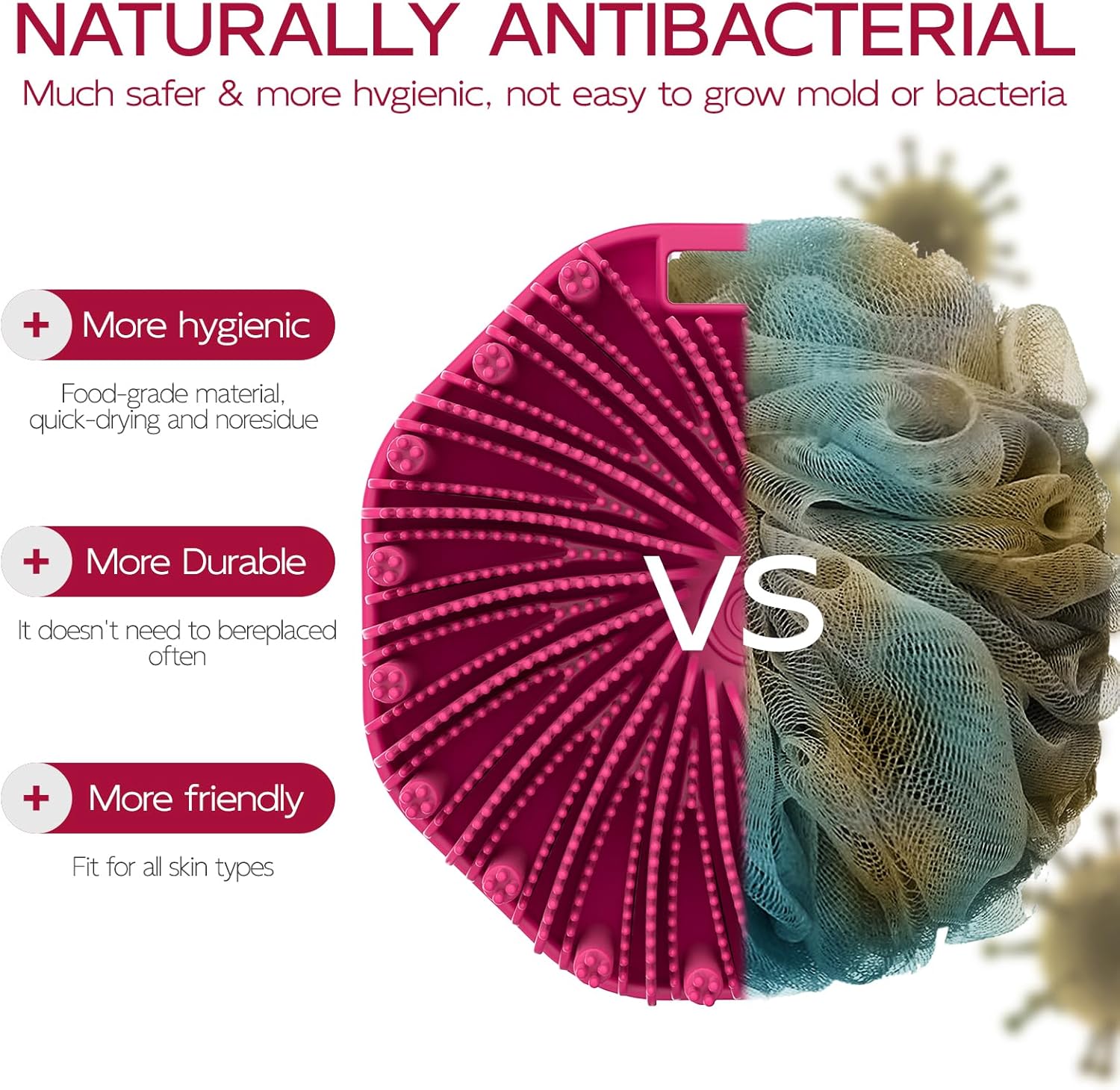 - PORTABLE AND DURABLE: With a convenient hanging hole, our silicone bath scrubber is perfect for home or travel use. The soft silicone bristles and non-slip handle ensure durability and ease of use.