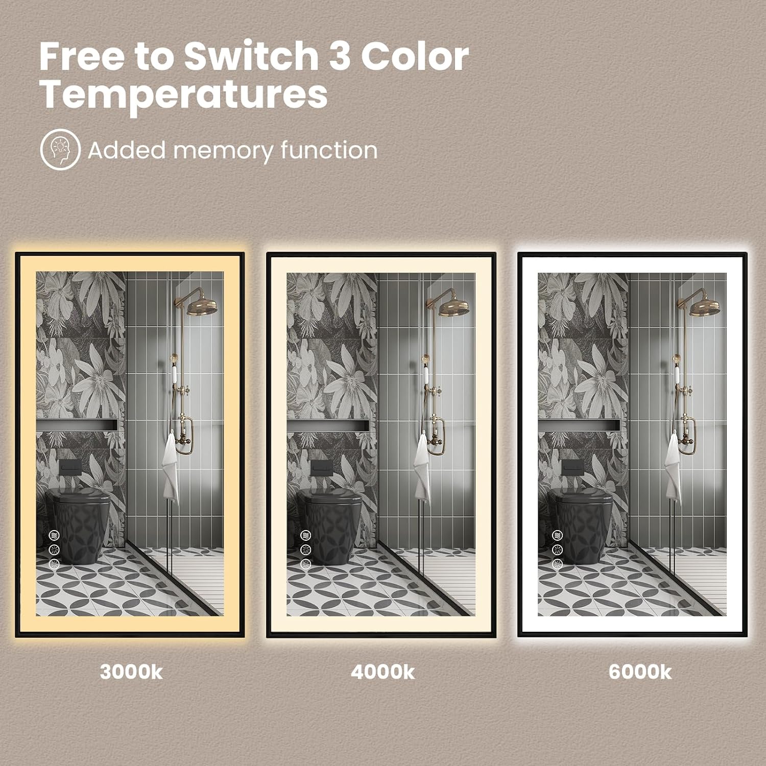 - [Anti-fog]: After a few minutes of opening the defogger, the heater in the mirror will disperse the fog from the center to sides, the mirror will still reflect clearly in the bathroom surrounded by hot air; It will turn on with the power on and automatically turns off after 1 hour