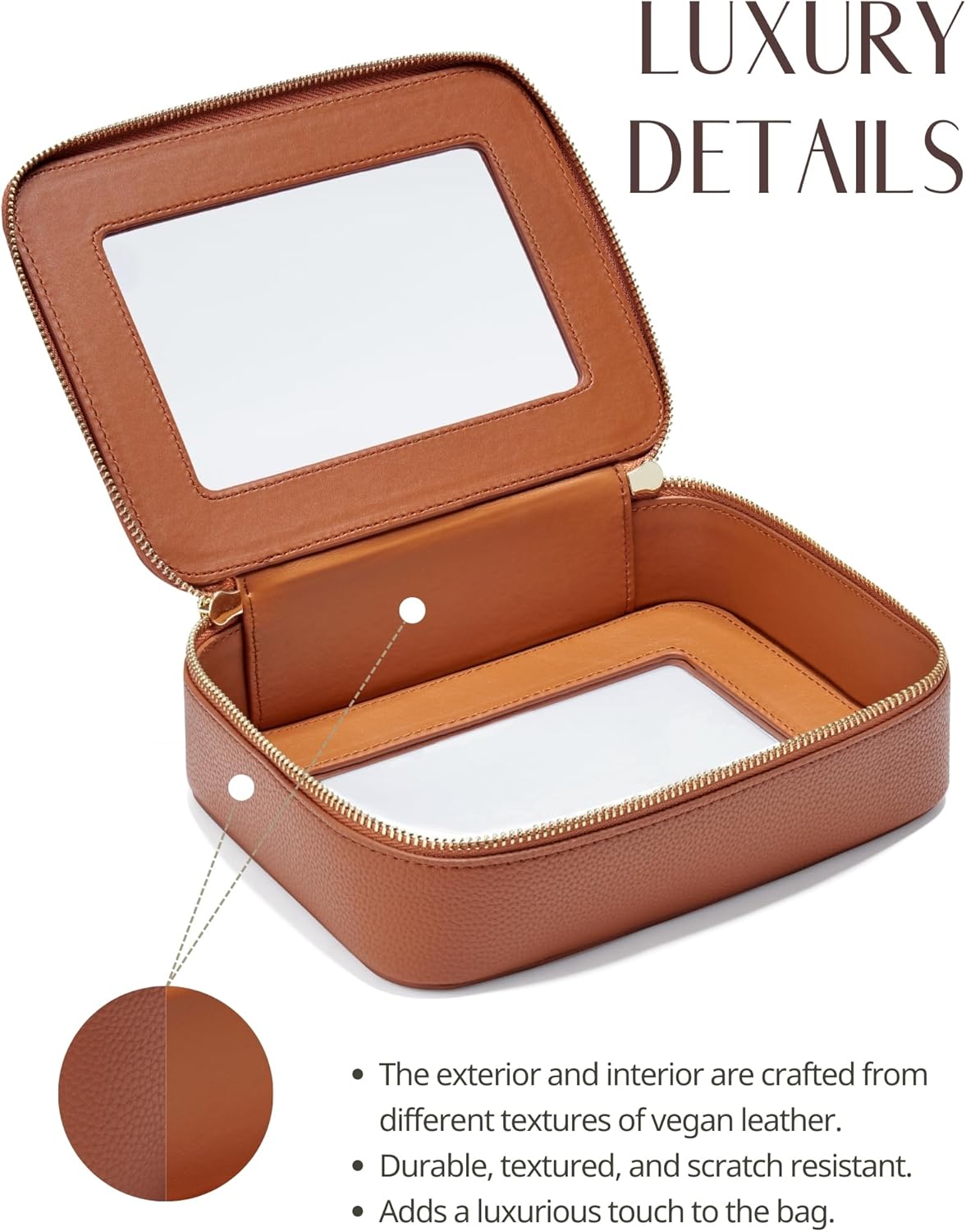- [Premium Material and Durability] – The clear small cosmetic case, both the exterior and interior, is crafted from high-grade faux leather of different textures, which is highly scratch resistant, durable and exceptionally easy to keep clean. It features a smooth zipper for secure closure, and elegant light gold metal hardware accents, adding a luxurious and sophisticated touch to the bag's overall design.