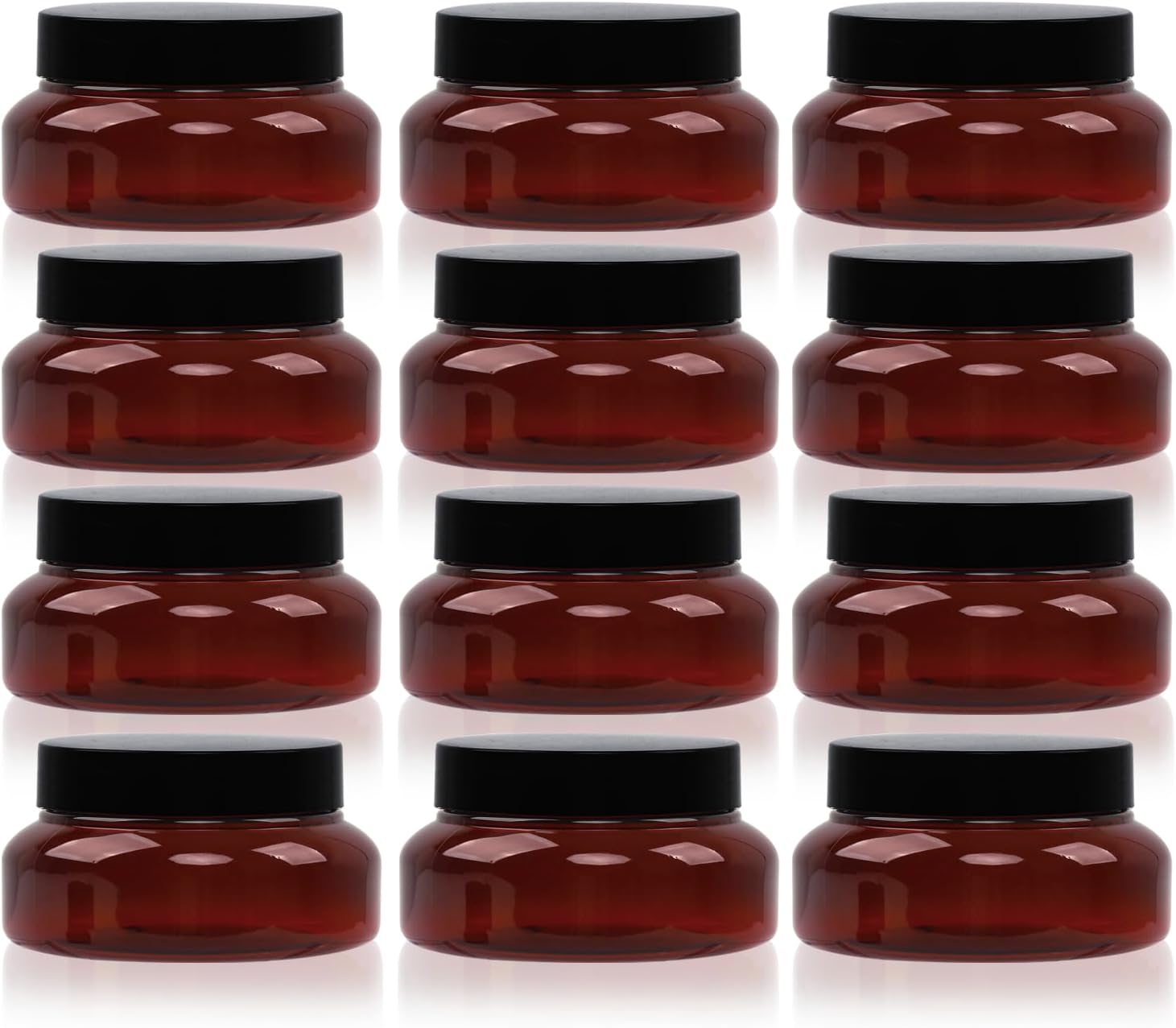 Amber Plastic Jars with Lids, 12 Pack Brown Body Scrub Jars Empty Refillable Containers Round Low Profile Samples Jars for Lotion, Body Butter, Sugar Scrub, Cream (5.3 OZ)