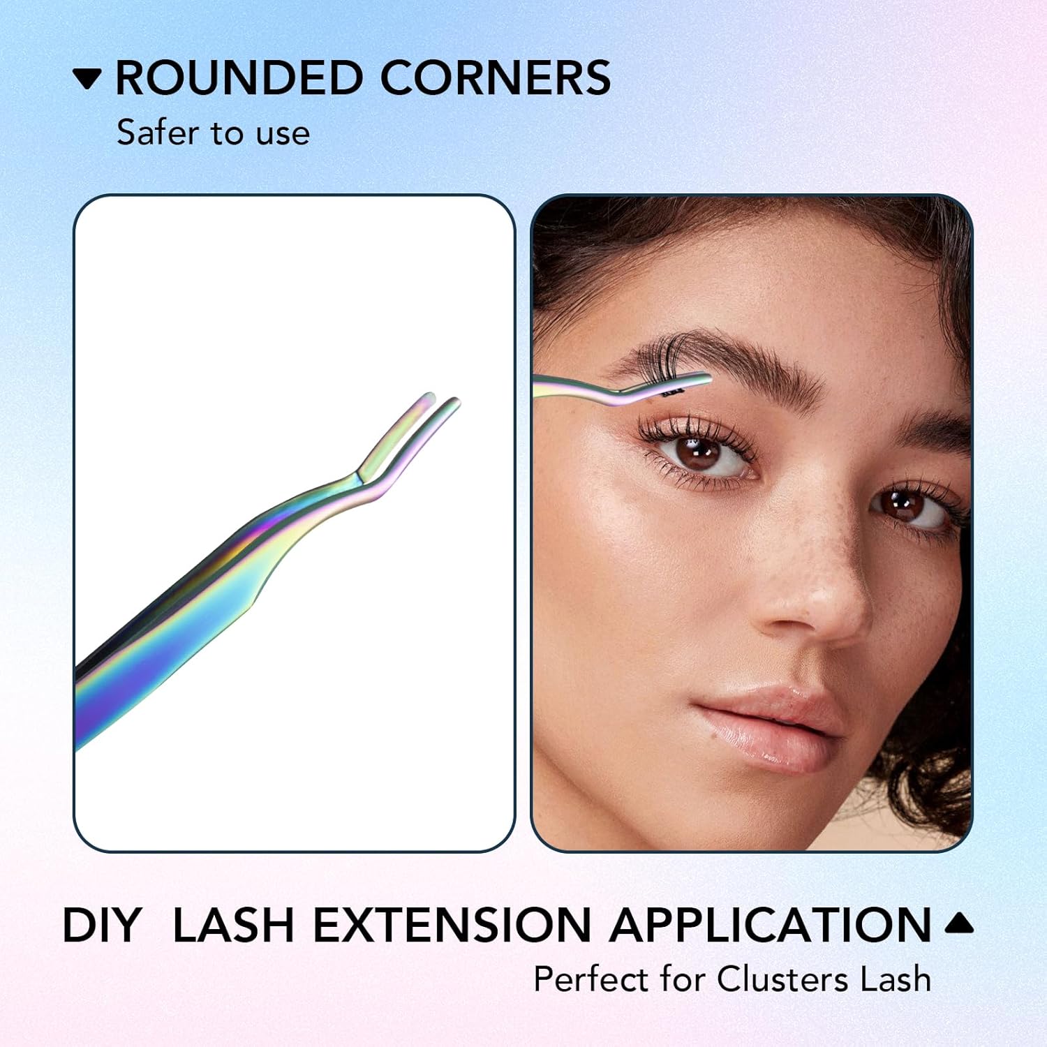 - 【 Premium Material 】 The false eyelash tweezers made of high quality stainless steel, durable and not easy to rust. The curved shape is very suitable for your eyes, and it is comfortable to use.TIPS: Please clean the eyelash cluster applicator after each use to ensure there is no glue residue on lashes clusters tweezers to keep them for long-term use