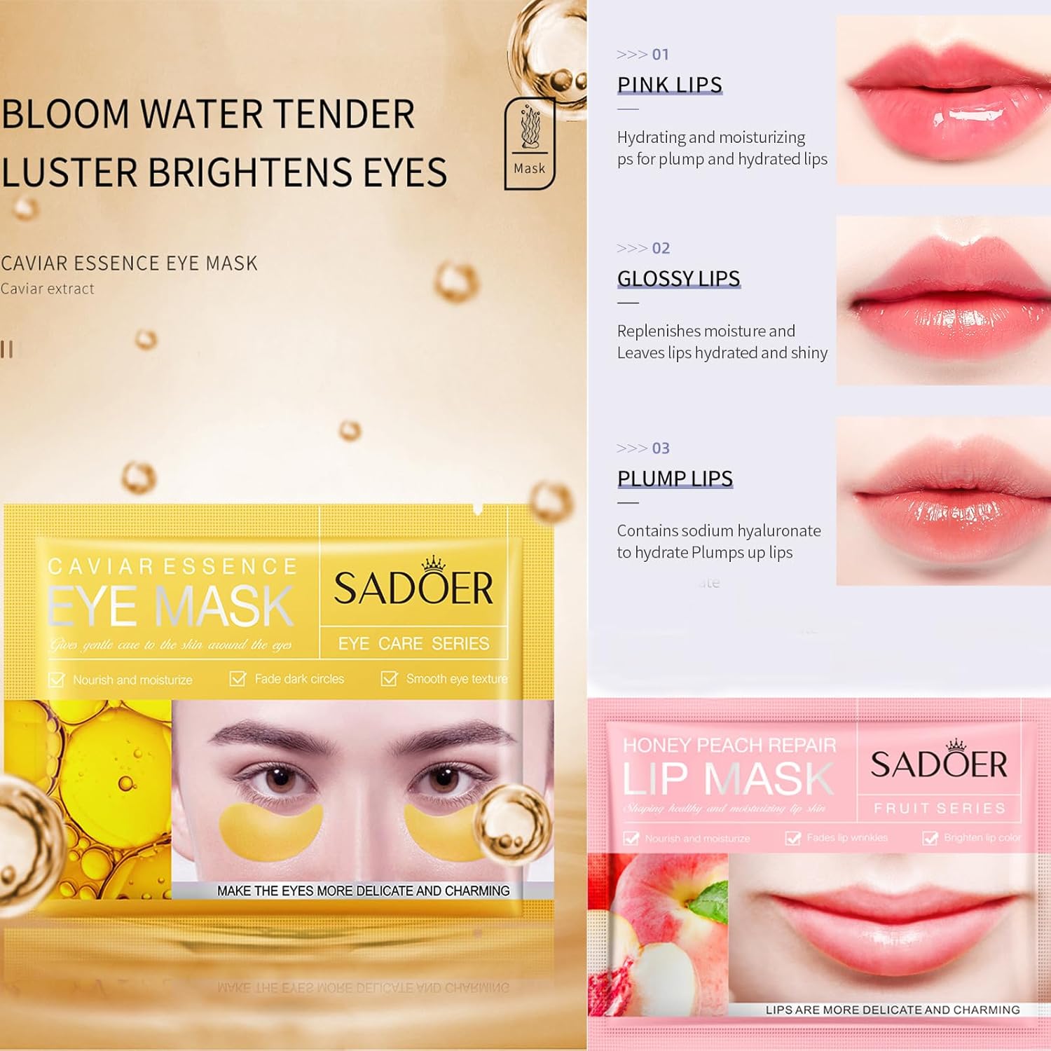 MEICOLY 30 Pads Eye and Lip Masks Sheet,Moisturizing Caviar Under Eye Mask,Hydrating Peach Lip Masks,Crystal Anti-Aging Eye Patches Dark Circle Remover with Box,15 Eye Mask+15 Lip Mask