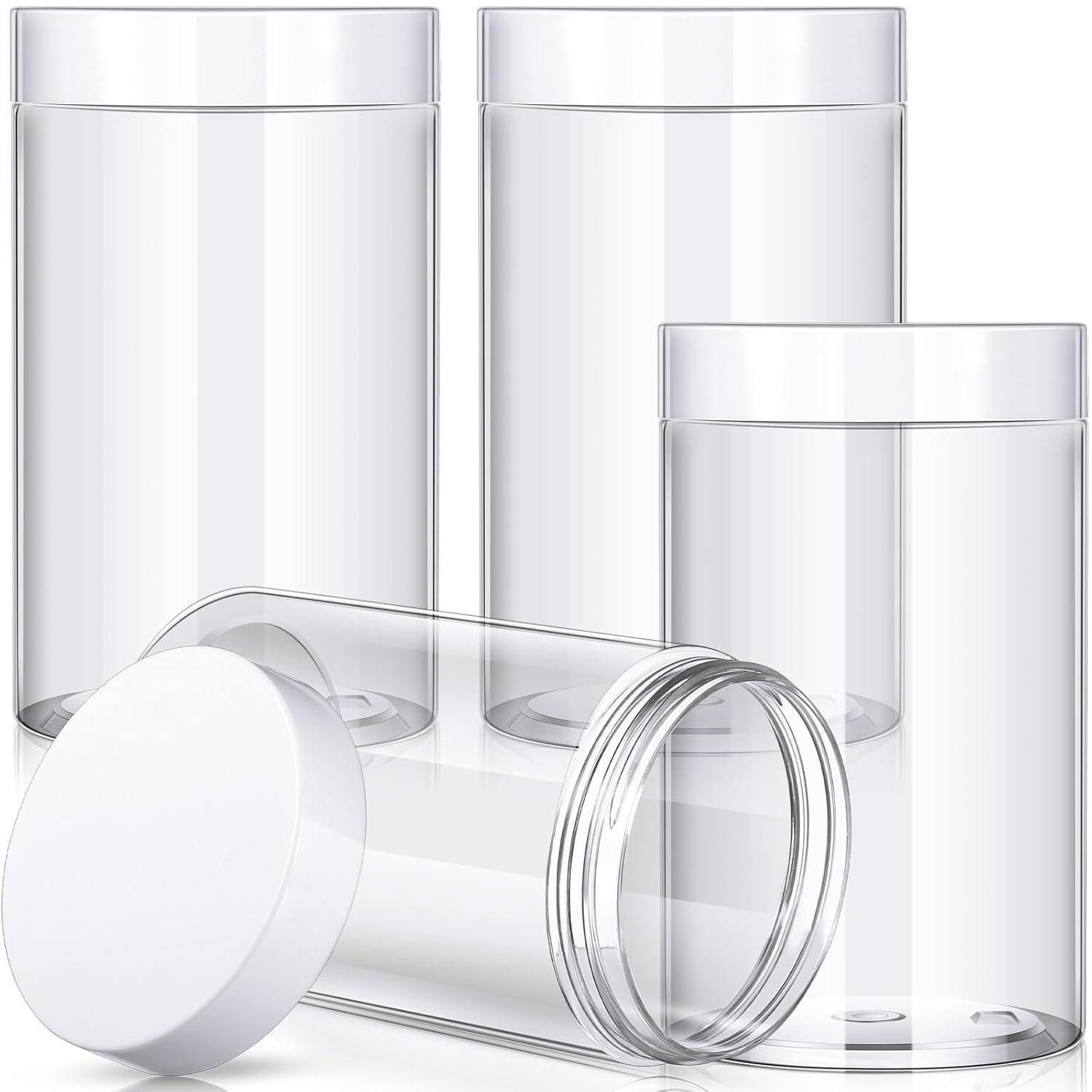 - What you receive: there are 4 pieces plastic jars with white screw-on lids; They are reliable and refillable, measuring about 32 oz in capacity
