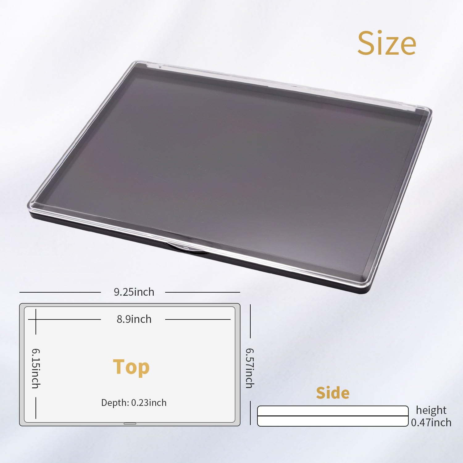 - Magnetic Makeup Palette Size:Length Outside: 9.25inch,Width Outside: 6.57inch, Depth Outside: 0.47inch; Length Inside: 8.9inch ,Width Inside: 6.15inch, Depth Inside: 0.23inch, providing storage for up to 48pcs 1 inch diameter eyeshadows.
