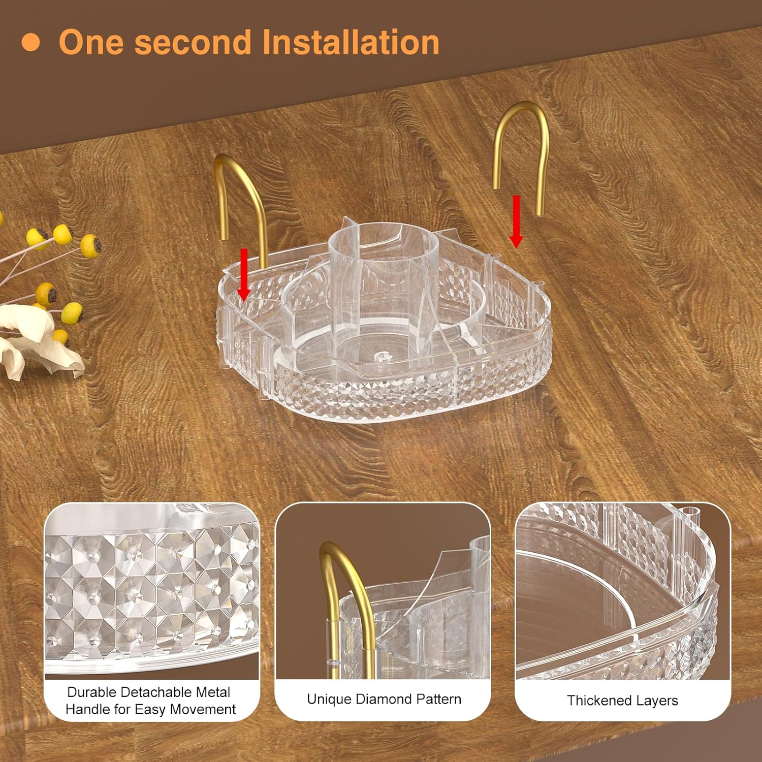 - Multifunction:➤The spinning organizer can be used to store cosmetics, such as:perfume, brushes,nail polish, lipstick,eye shadow,makeup powder, or store bathroom supplies, such as:toothbrush, toothpaste,razor,body lotion.You can use non-compartmented plates as food display plate to store vegetables, fruits, pastries, snacks, etc, or store condiments.