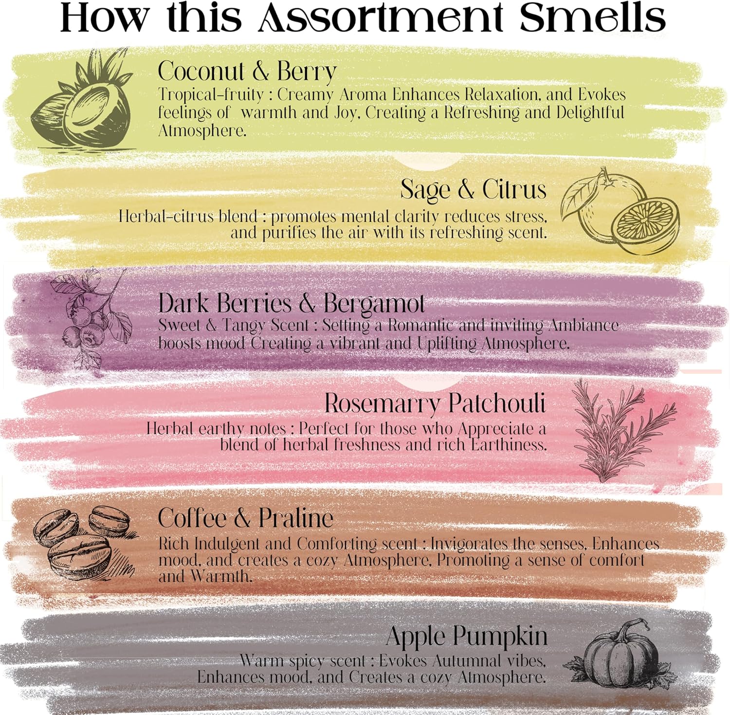 - Scent : Sage, Apple Pumpkin, Coconut, Coffee, Rosemary Patchouli
