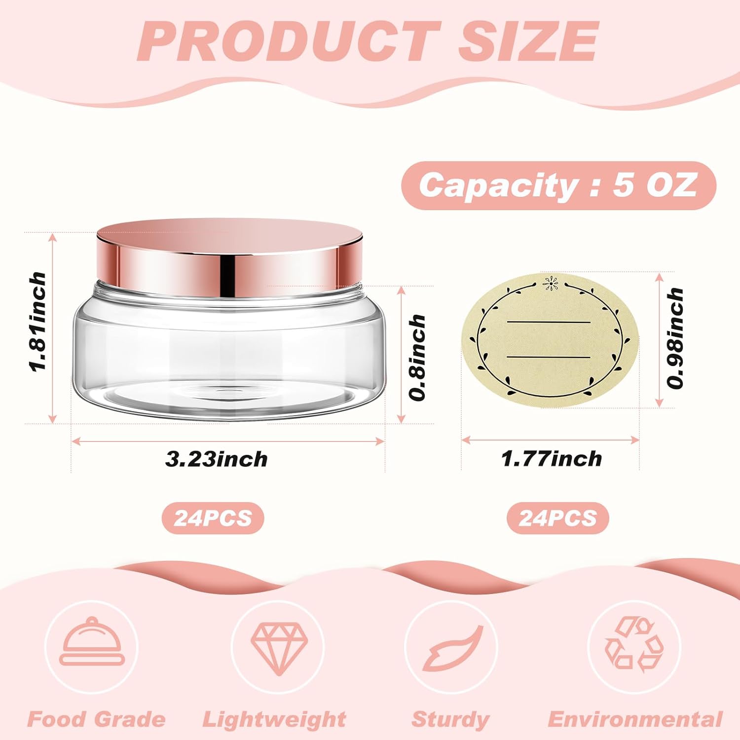 Tessco 24 Pack Plastic Jars with Lids Labels Empty Clear Plastic Jars Round Refillable Cosmetic Containers Body Butter Containers Bulk Sugar Scrub Bottle for Make Up(5 oz,Clear, Rose Gold)