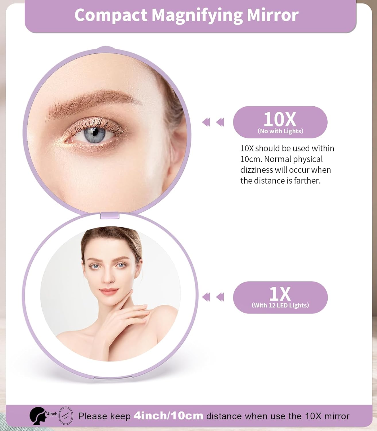 - 10x Magnifying:10x compact magnifying mirror, better magnification of facial details,which is good for makeup needs, shaving, or deep cleaning.Tip: When using the 10x magnifying mirror, please keep a distance of less than 10 cm, otherwise it may cause normal dizziness and affect imaging