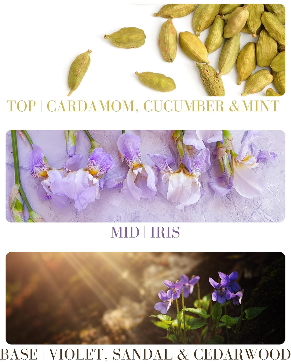 - SCENT PROFILE - Top: Cardamom, Cucumber, Mint, Mid: Iris, Base: Violet, Sandalwood, Cedarwood. Santal is a fragrance that embraces the idea of freedom, roaming wild, and being under big skies. Bursts of fresh green notes await you with Cucumber and Mint, followed by Cardamom, Iris, and Violet notes that tumble into Australian Sandalwood, Cedarwood, and warm spices. All are rounded out with leather, musk, and notes of spice. One to use as you sit around a campfire as the sun slowly sets.