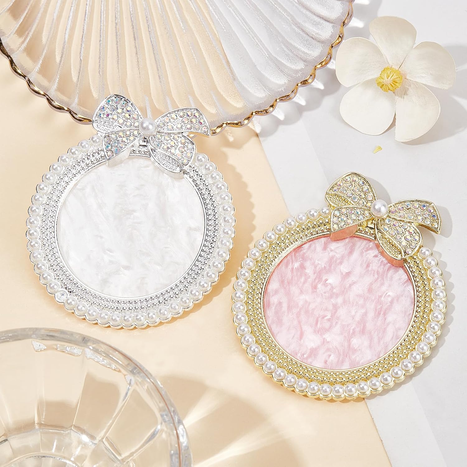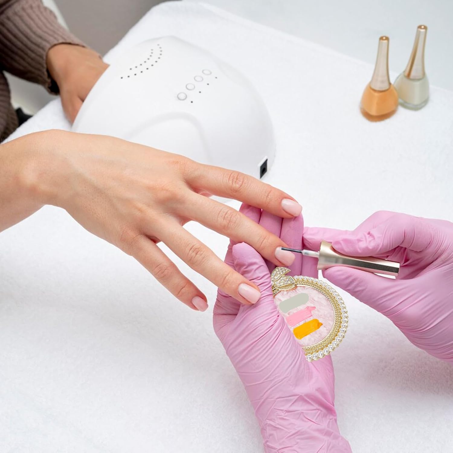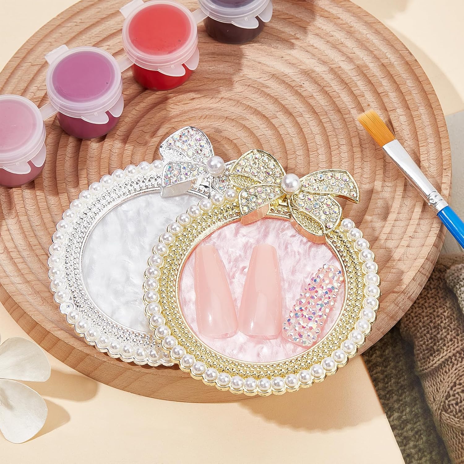 NICENEEDED 2 PCS Resin Nail Art Palette, Nail Art Painting Mixed Color Makeup Palette with Pearls, Rhinestone Bowknot Edge Nail Polish Palettes Nail Art Display Board for Nail Salon