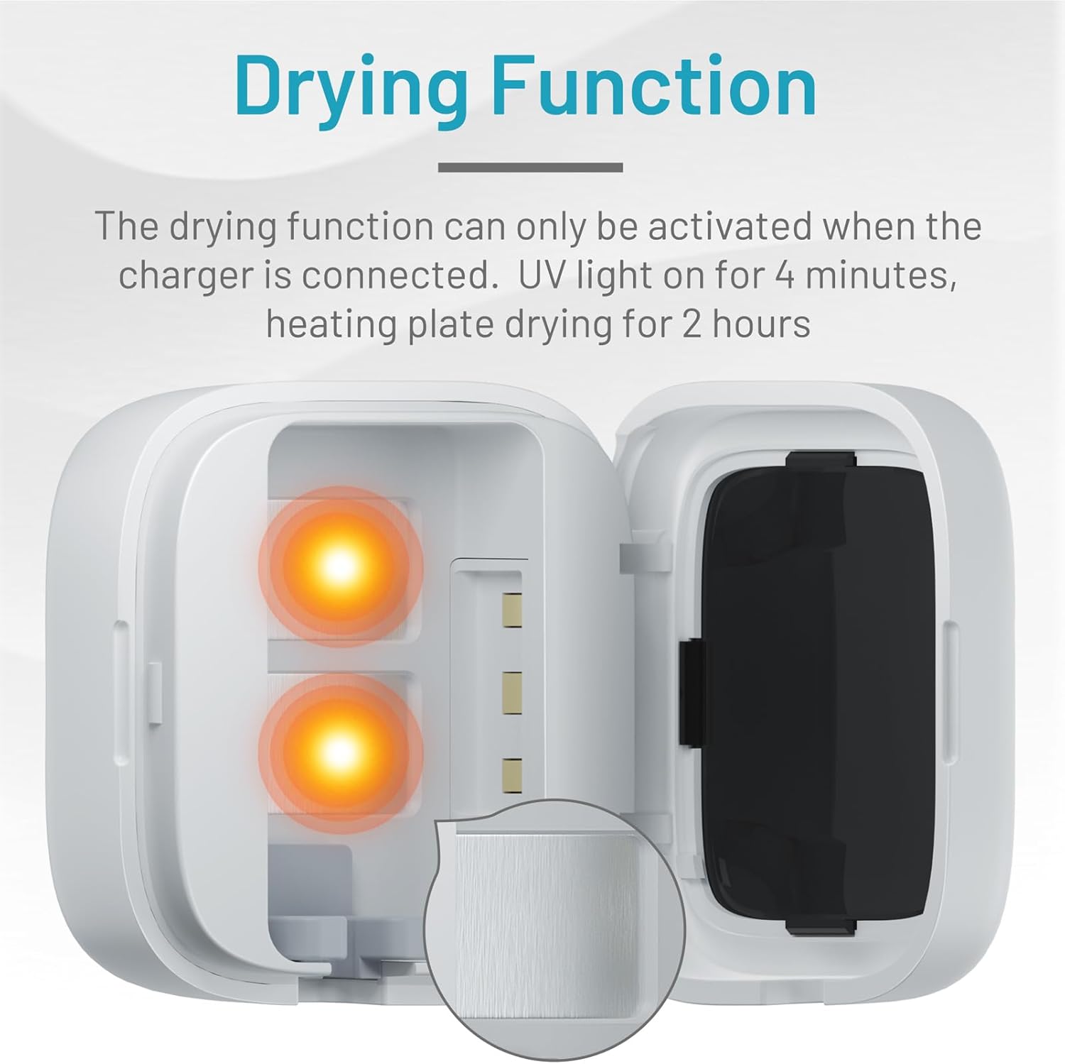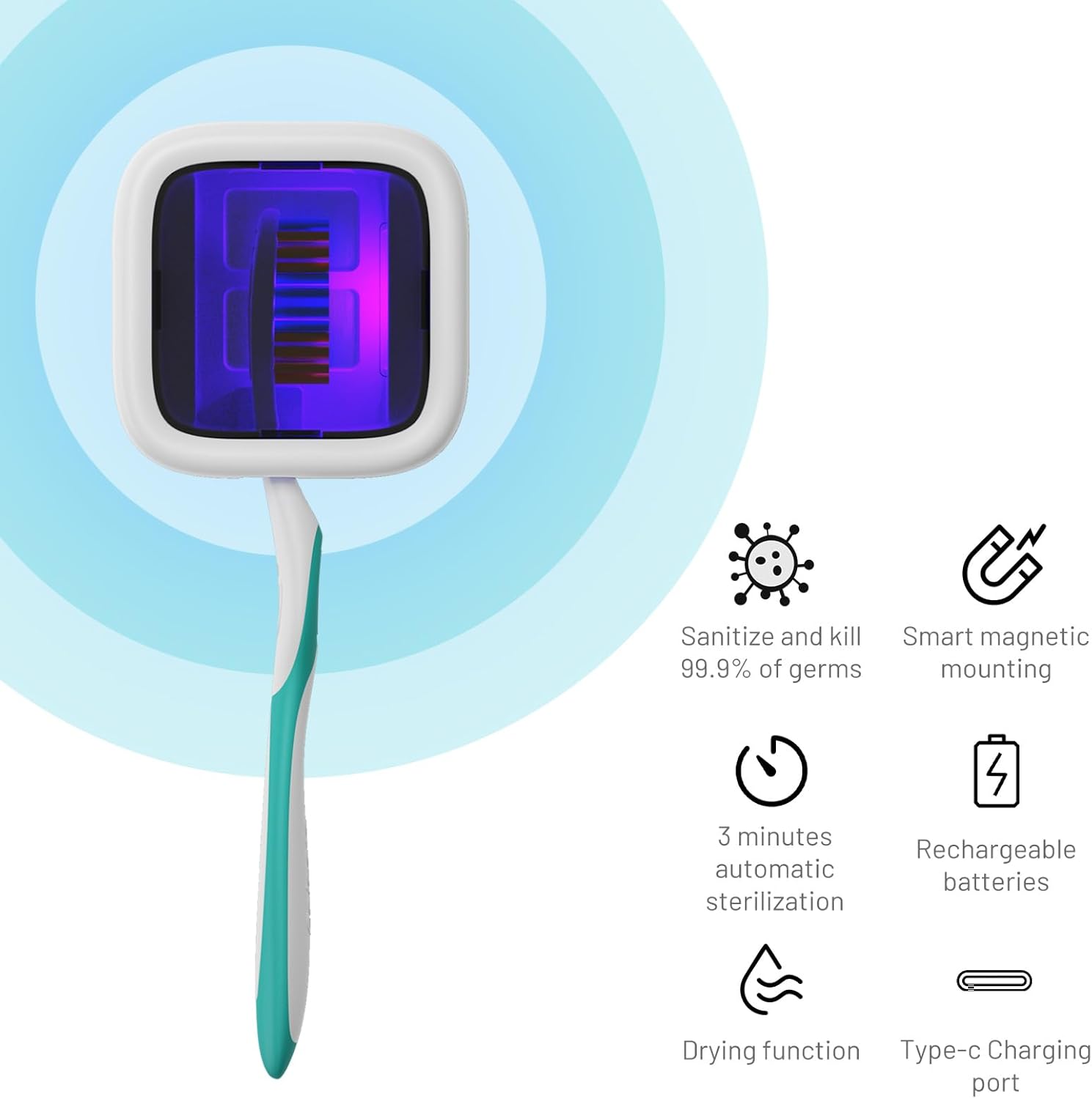 - With Drying Function: When used with the charger connected, activate the drying mode, the UV light works for 3 minutes and then dries for 2 hours to dry your toothbrush