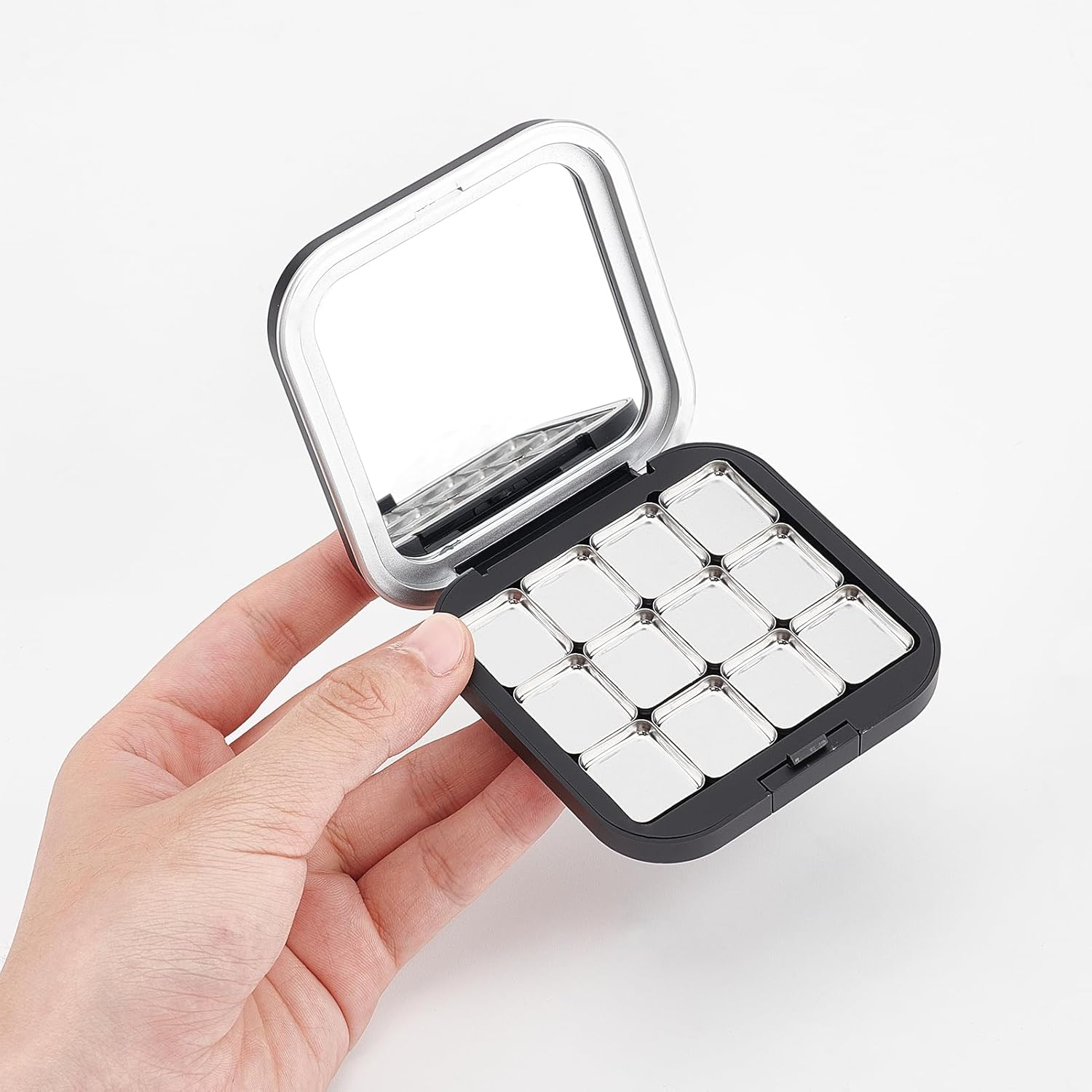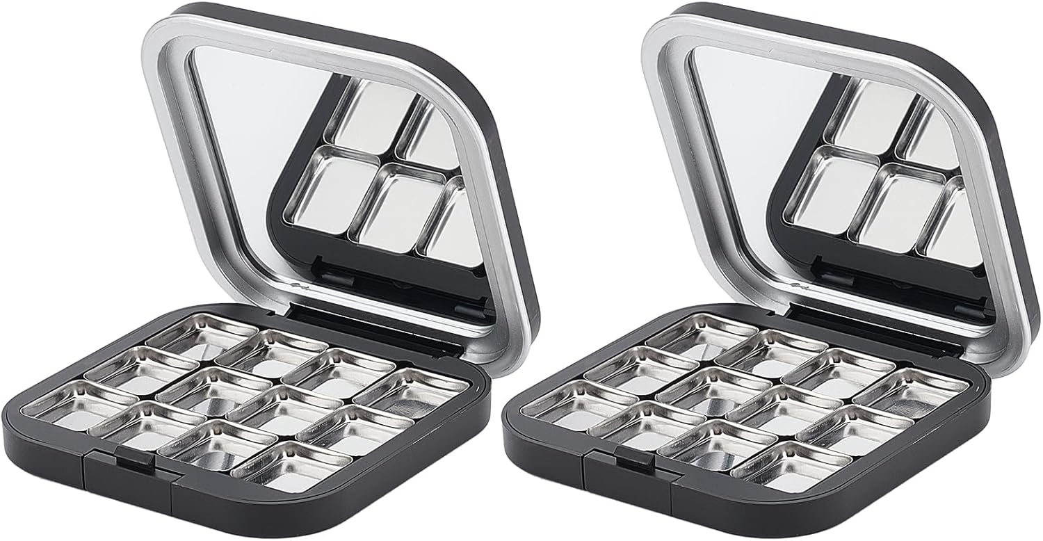 - SIMPLE TO USE: The empty eyeshadow palette is a refillable storage case designed with 12 grids to store different colors. Simple yet delicate, it is perfectly sealed to prevent unnecessary leakage.
