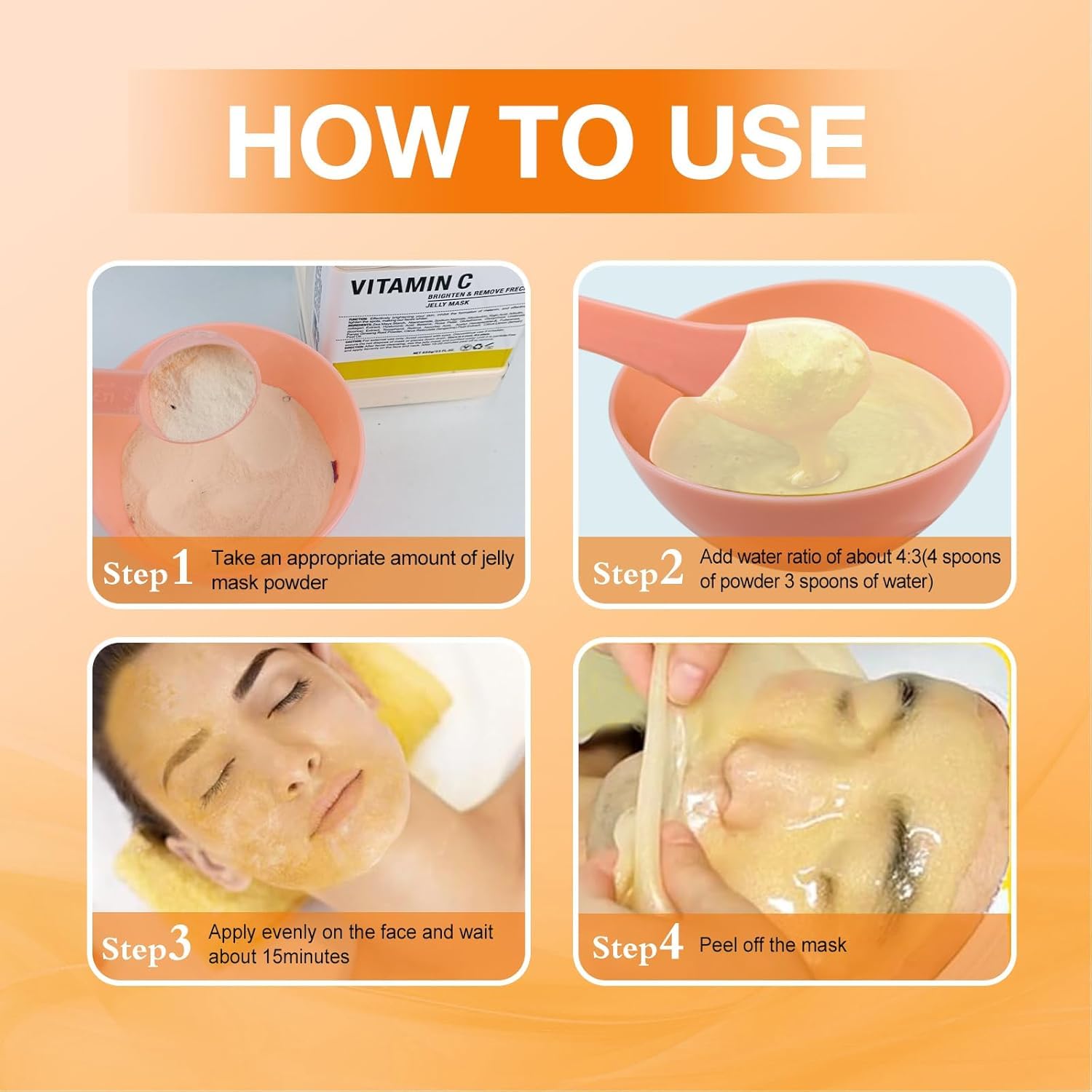 - 【EXPERIENCE PROFESSIONAL SPA AT HOME】 Mix the jelly mask powder and water in the bowl in a 4:3 ratio until combined. If you feel that it is too thin and it will slide down your face, you can add more powder. If you feel that it is too dry to fully absorb, you can add some water. The gel mask for face is fast acting, does not drip, and need 20 minutes of regular use for lasting results. With this peel off hyaluronic acid powder, you can experience a comfortable and undisturbed professional spa experience at home. It is more cost-effective than beauty salons.