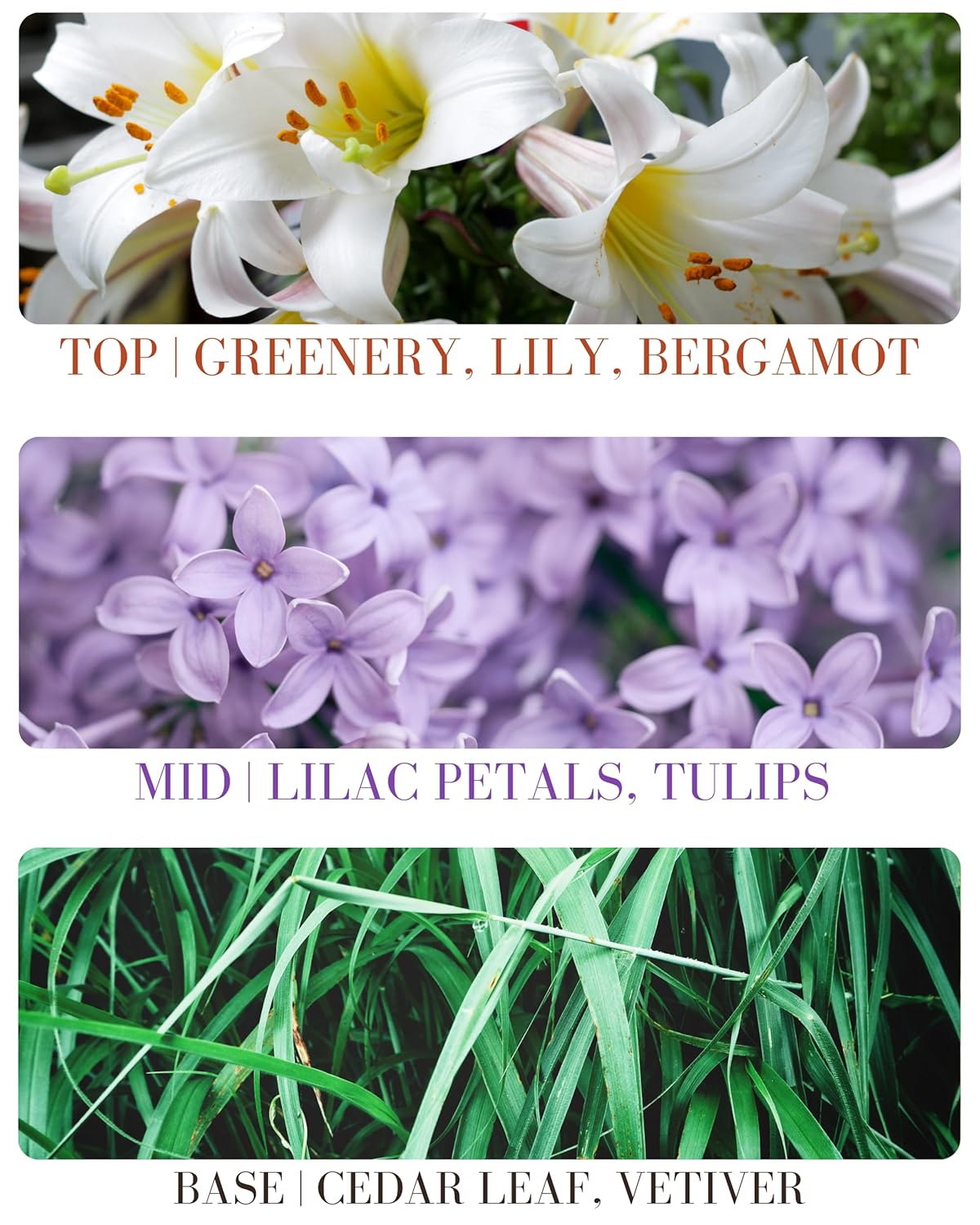 - SCENT PROFILE - TOP: Greenery, Lily, Bergamot MID: Lilac petals, Tulips BOTTOM: Cedar leaf, Vetiver