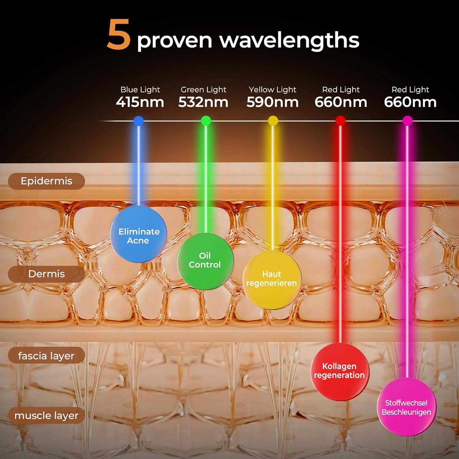 - 4 in 1 LED Red Light Therapy: Our red light therapy mask adopted 5 wavelengths (415nm, 532nm, 590nm, 660nm, 850nm) and 4 treatment modes (Anti-aging, Restoring, Brightening, Remove-acne) to provide a more comprehensive and efficient skin care experience to meet different skin needs. Say goodbye to single wavelength/mode red light mask devices.