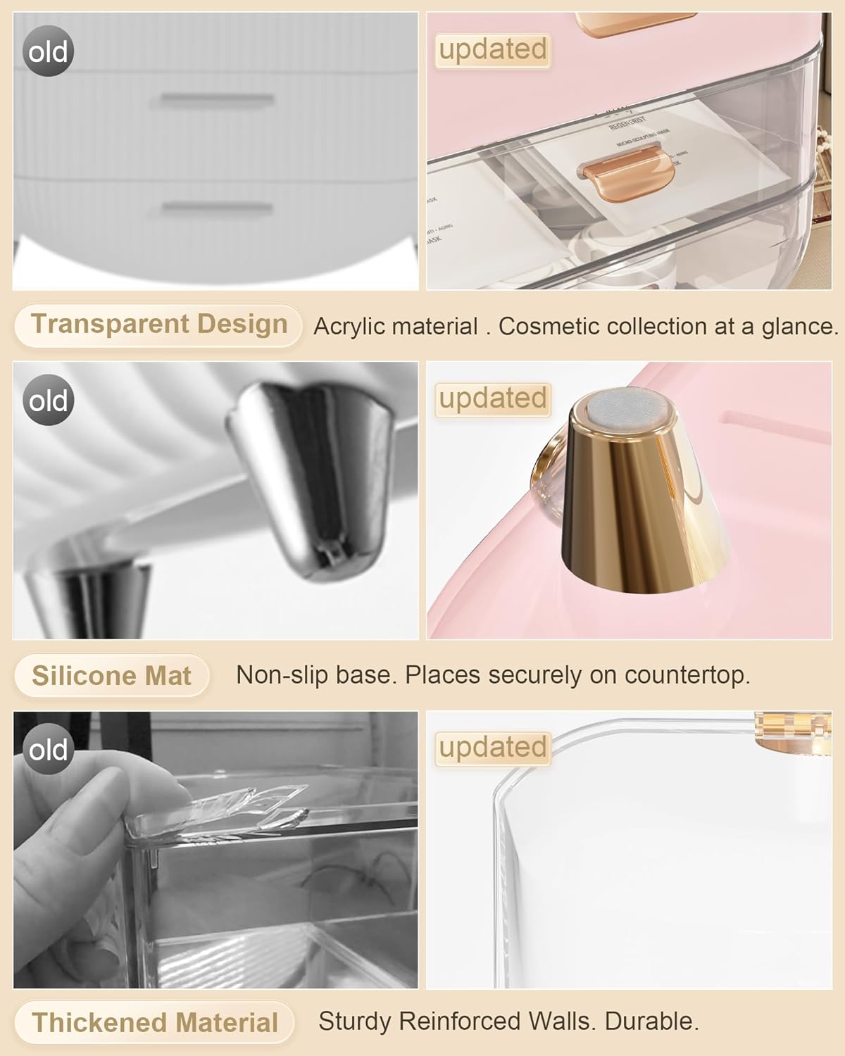 - ăThickened Material & Non-slipăReinforced and upgraded handle won't fall off. Easily move the skin care organizer to anywhere. The countertop organizer is made of thickened ABS material, which is stronger and more durable than normal ones. Drawer and clear top are able to open and close easily. Rubberized bottom, non-slip and won't scratch desktop.