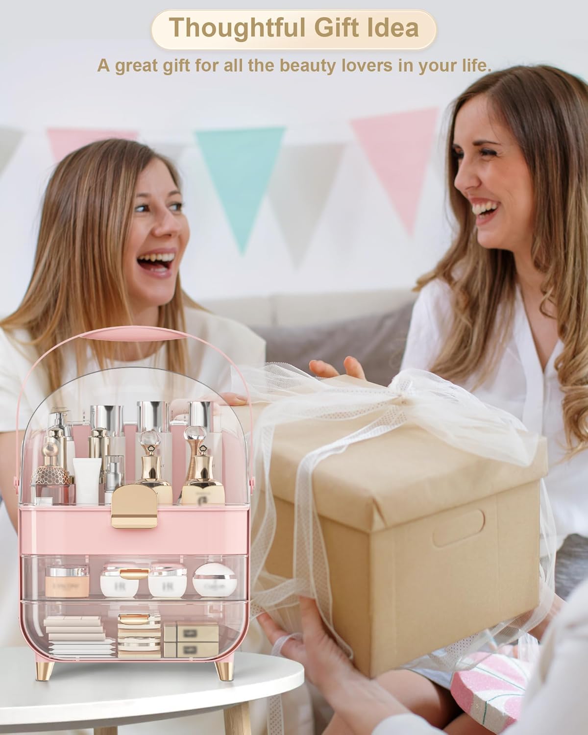 - ăStylish and ElegantăBeautiful rounded appearance. Adopting professional top design, suitable for any home and women's style. This makeup box is elegant on vanity, bedroom, dresser, countertop, bathroom. Delicate colour is suitable for any room decoration.
