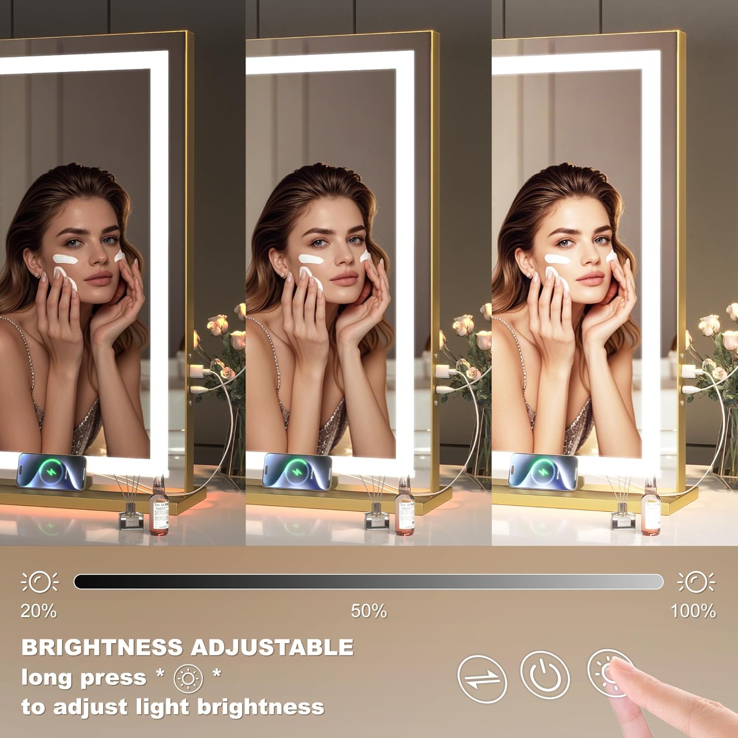- đăSmart Touch Control & Memory FunctionăThis makeup mirror with lights has 3 smart touch buttons, turn on/off the light by touching the sensor switch, Press left button to change the color modes, long press right button to adjust the led brightness. This lighted makeup mirror is specially designed memory functionfunction keep your lights setting like your last use.