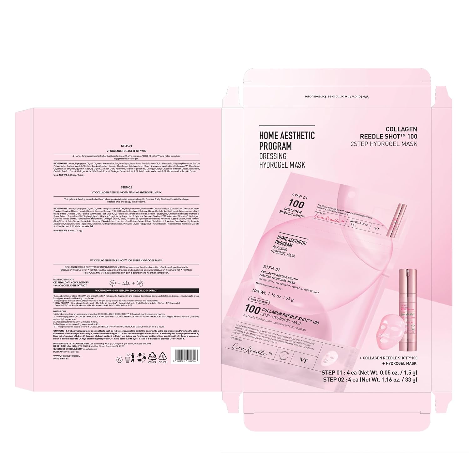 VT COSMETICS Collagen Reedle Shot 100 2-Step Hydrogel Mask(34.5gx4ea), Intensive Firming, Exosome 500Da Collagen, Fine Lines, Overnight Melting Mask, Korean Facial Mask, Pink Collagen