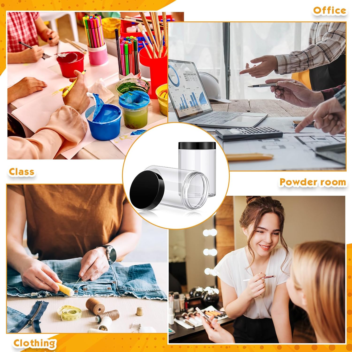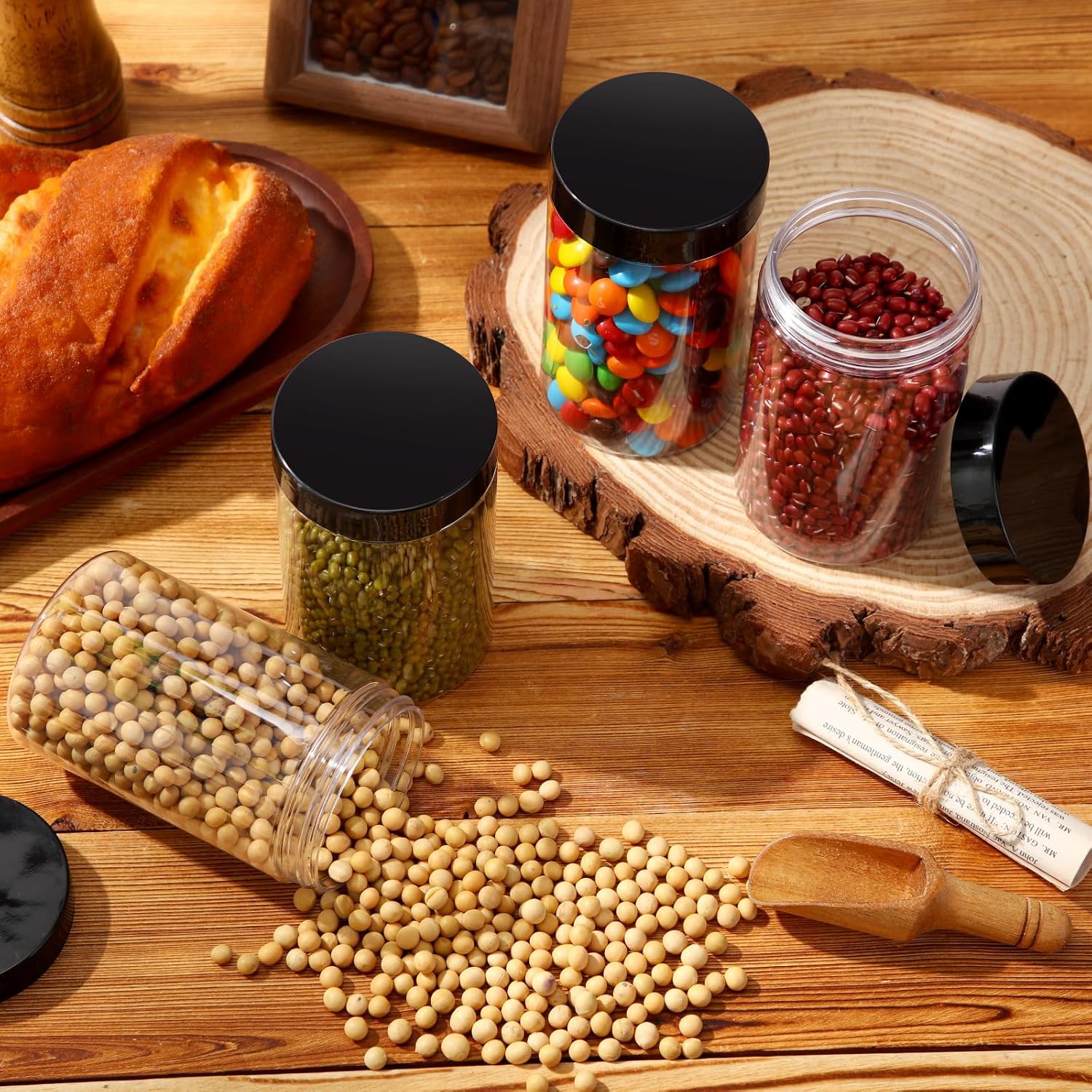 - What You Receive: there are 4 pieces plastic jars with black screw-on lids; They are durable and refillable, measuring about 12 oz in capacity