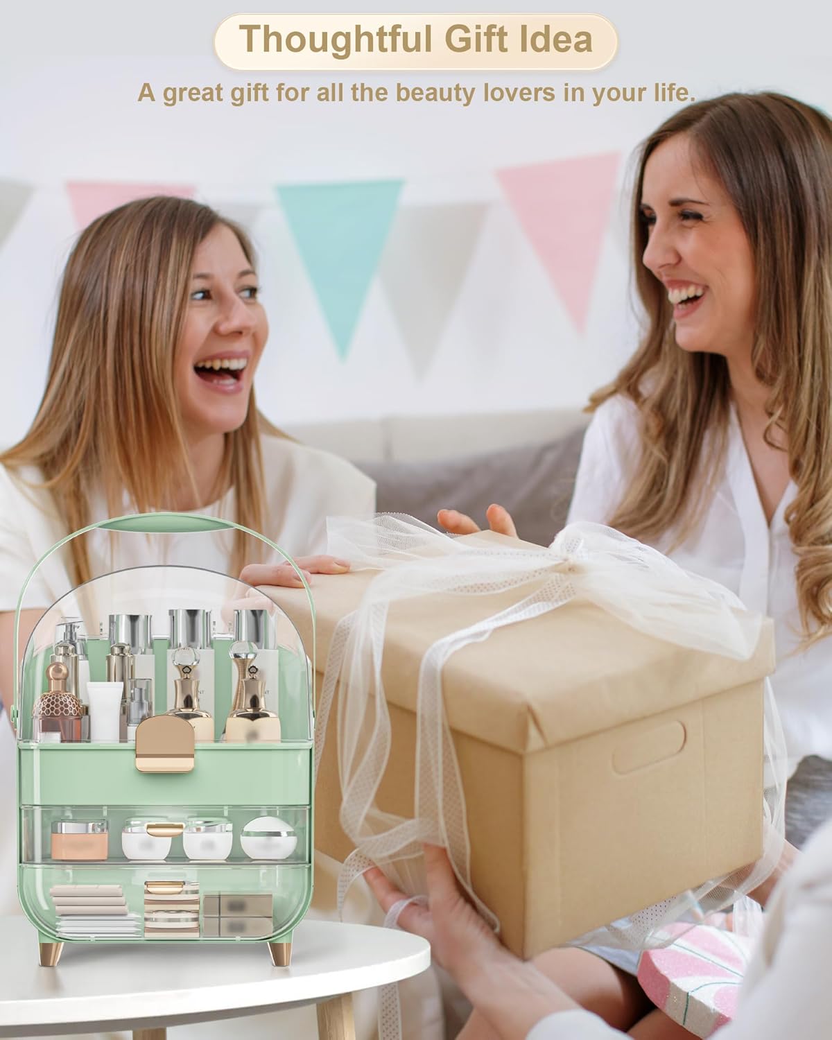 - ăStylish and ElegantăBeautiful rounded appearance. Adopting professional top design, suitable for any home and women's style. This makeup box is elegant on vanity, bedroom, dresser, countertop, bathroom. Delicate colour is suitable for any room decoration.