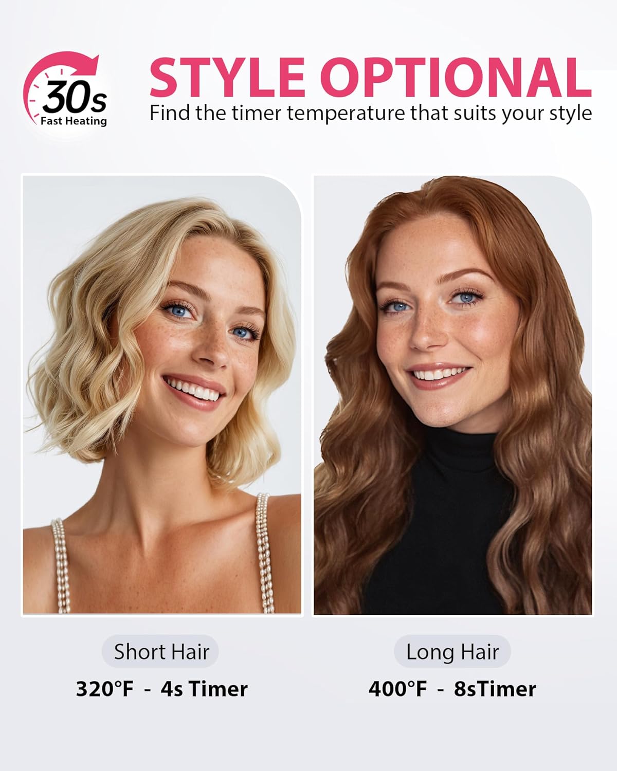 - Ready in 30 Seconds - Style Faster: Don't wait! Our advanced PTC heating system gets your curling iron hot and ready for perfect waves in just 30 seconds. Achieve salon-worthy styles in no time. (Ultra-Fast Heating)